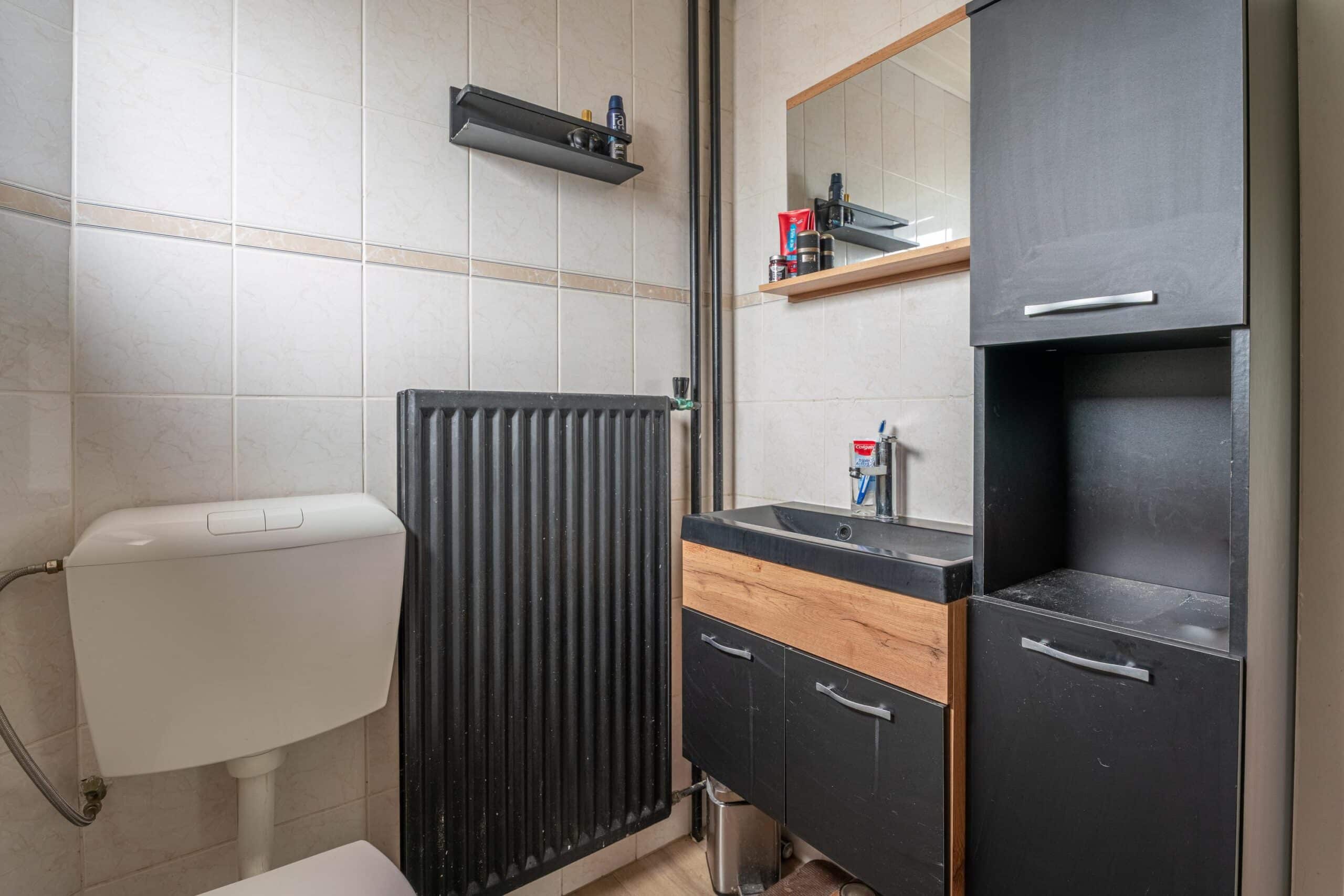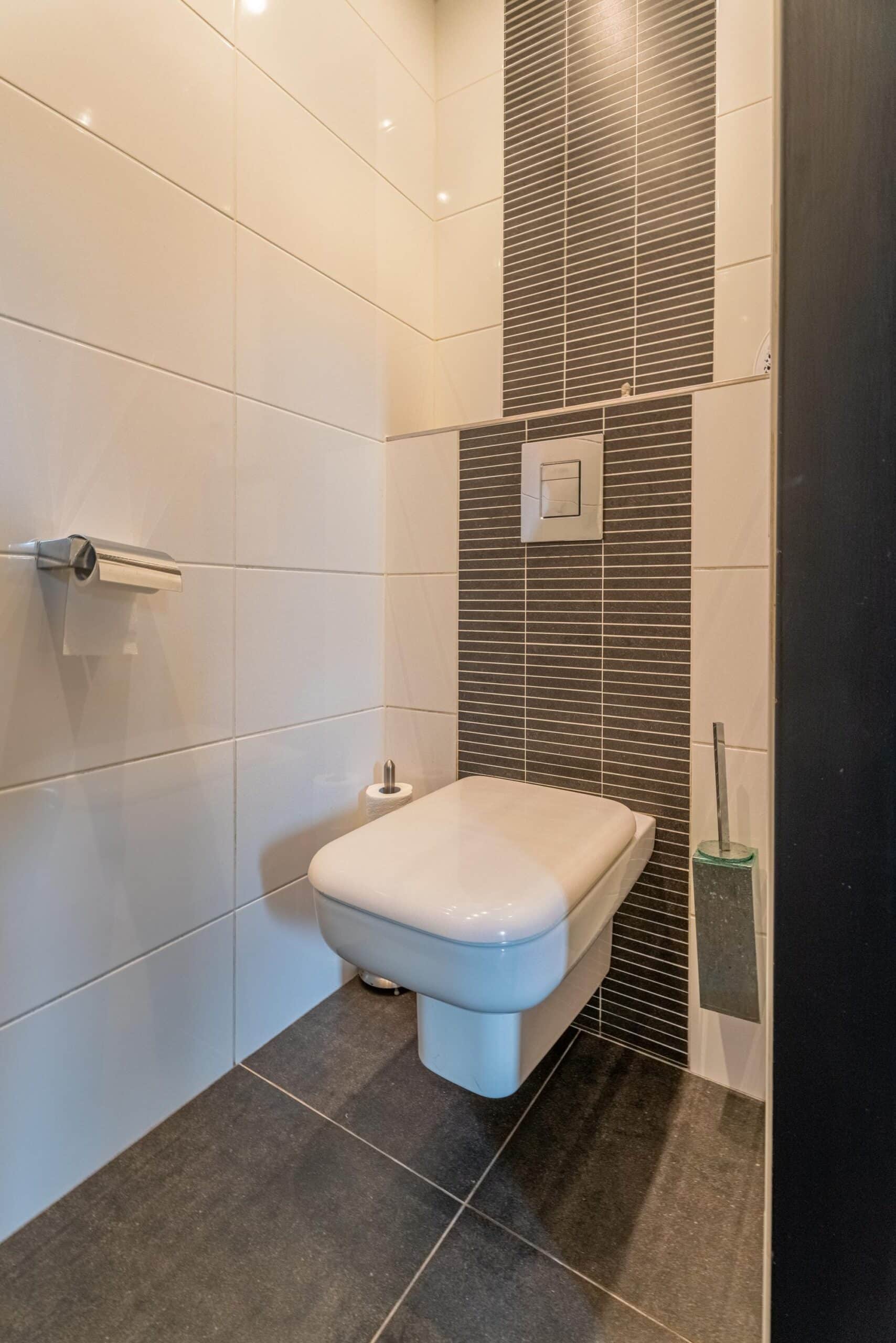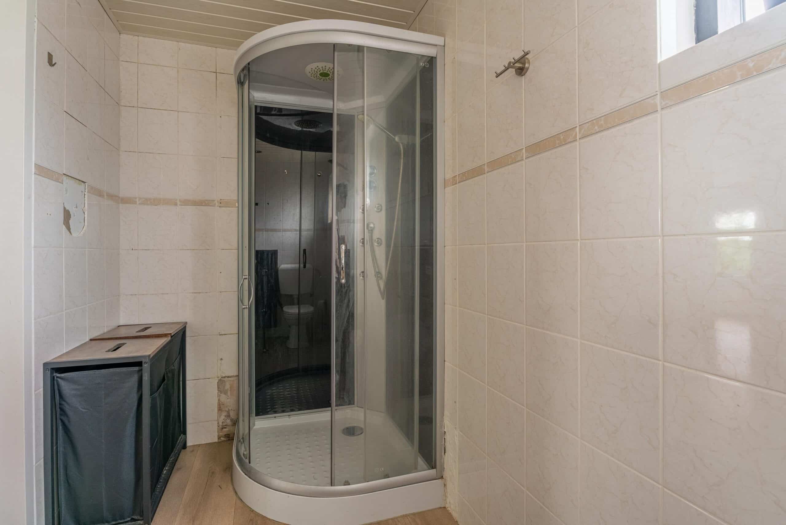 De badkamer is functioneel ingericht en beschikt over een douche, toilet en wastafelmeubel.