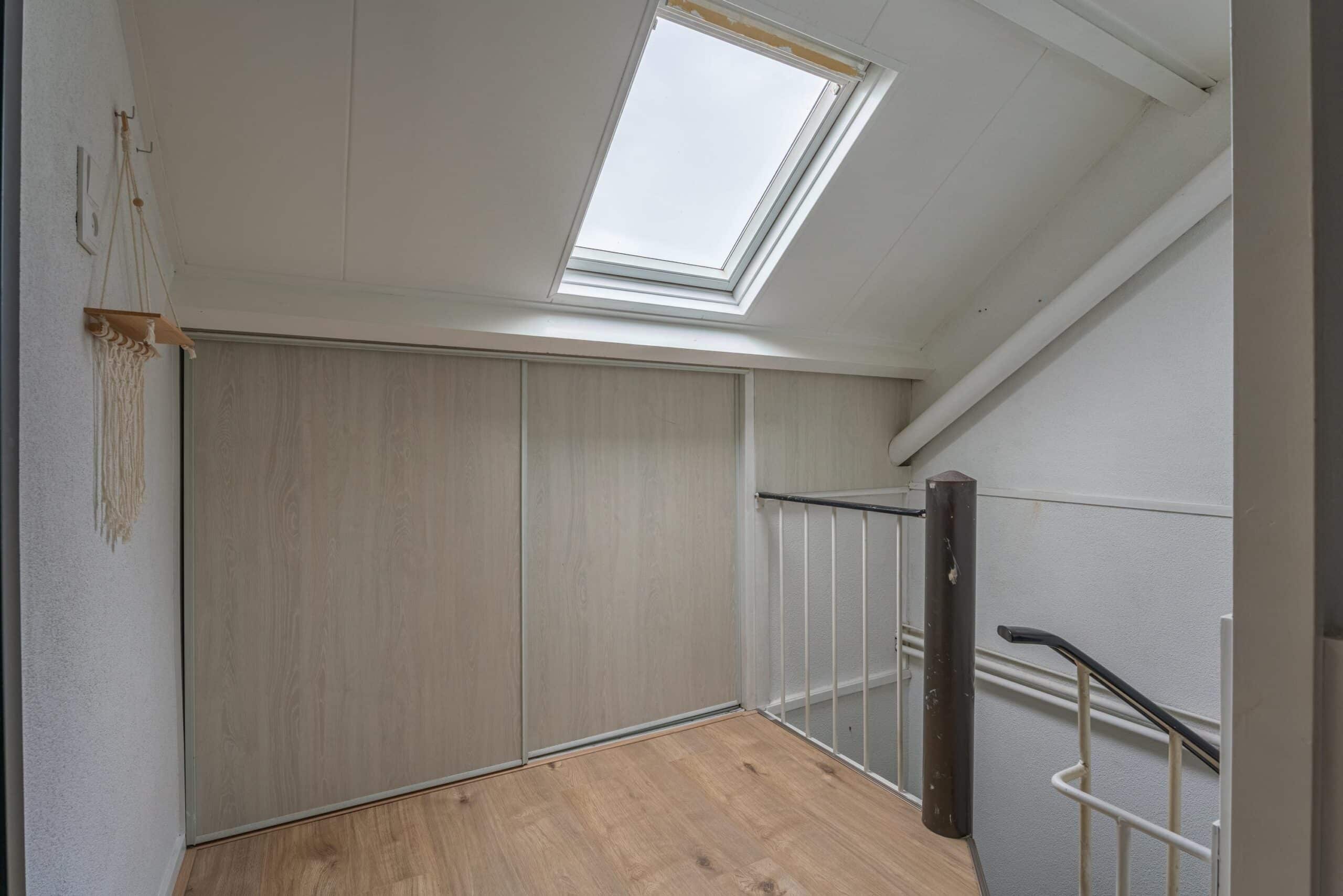 Overloop met bergruimte achter de knieschotten en opstelplaats voor de wasapparatuur. Op deze verdieping bevinden zich nog twee ruime slaapkamers, beide voorzien van een dakkapel, wat zorgt voor extra ruimte en licht.