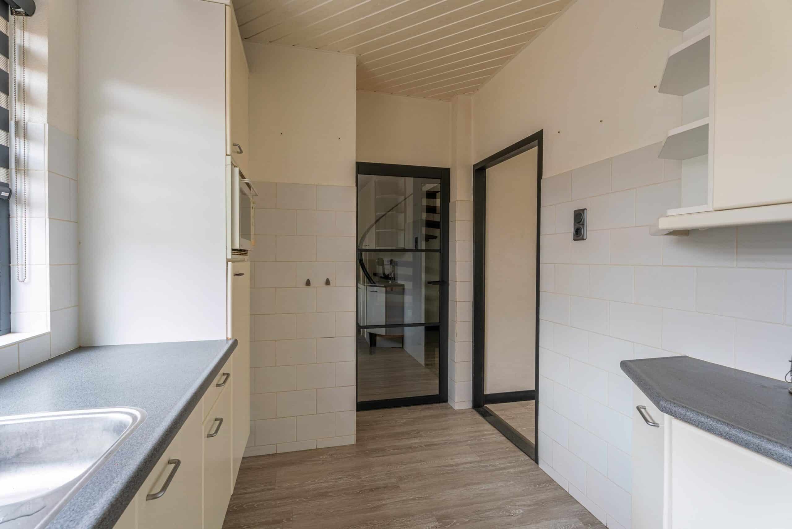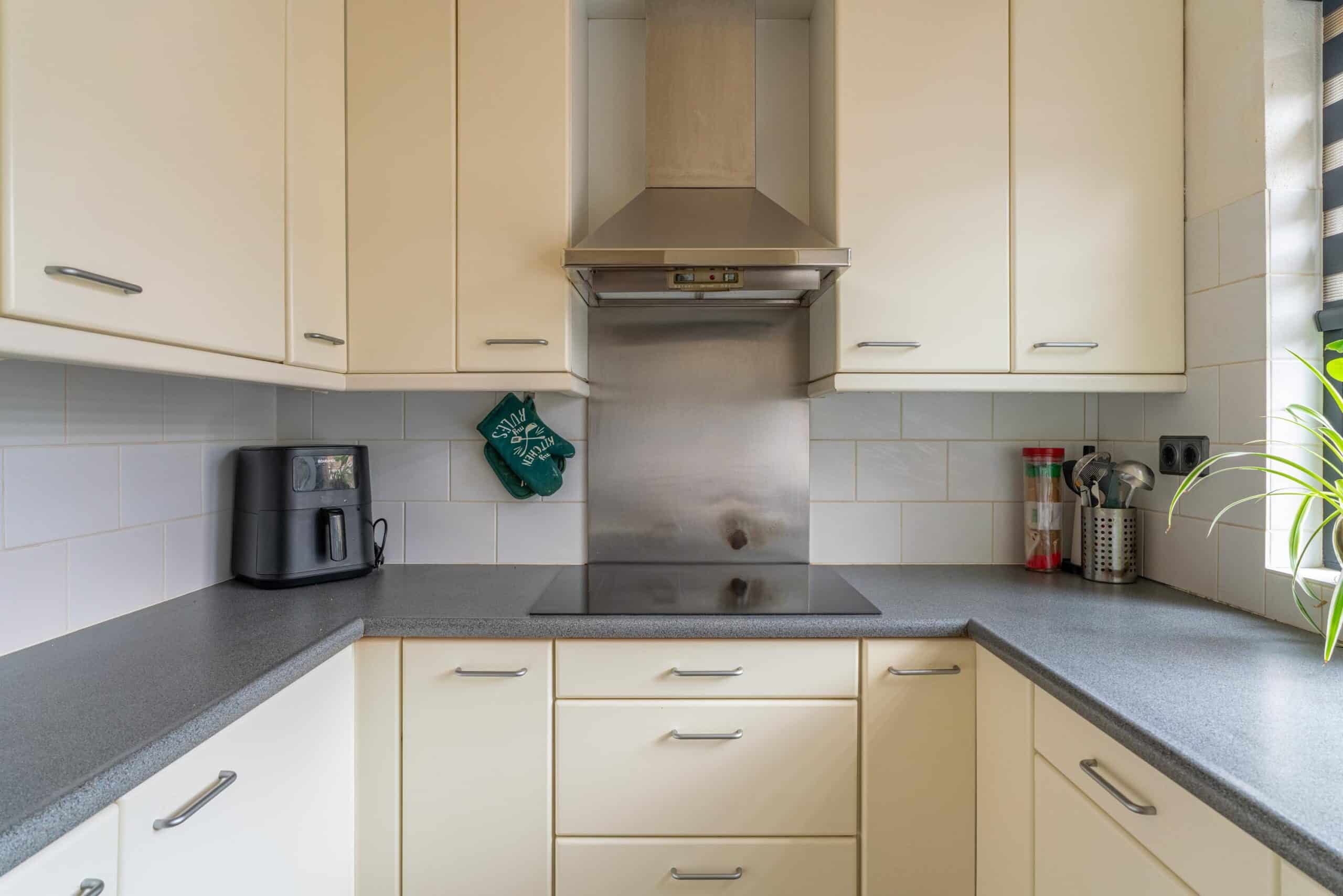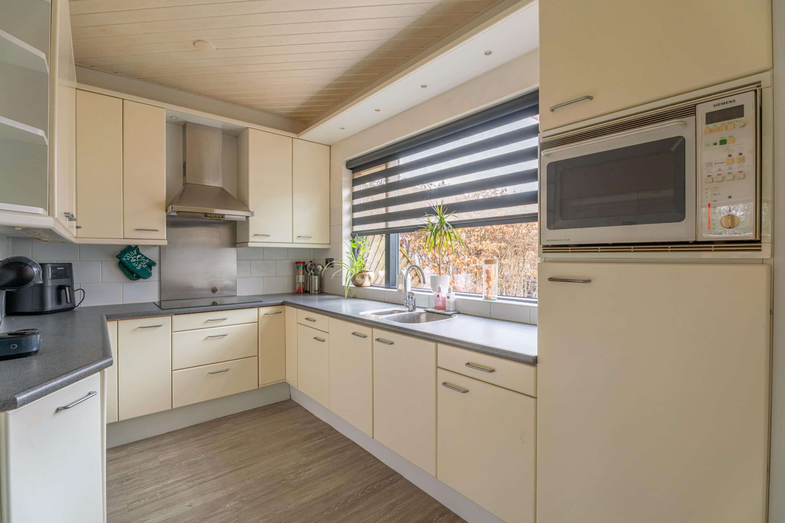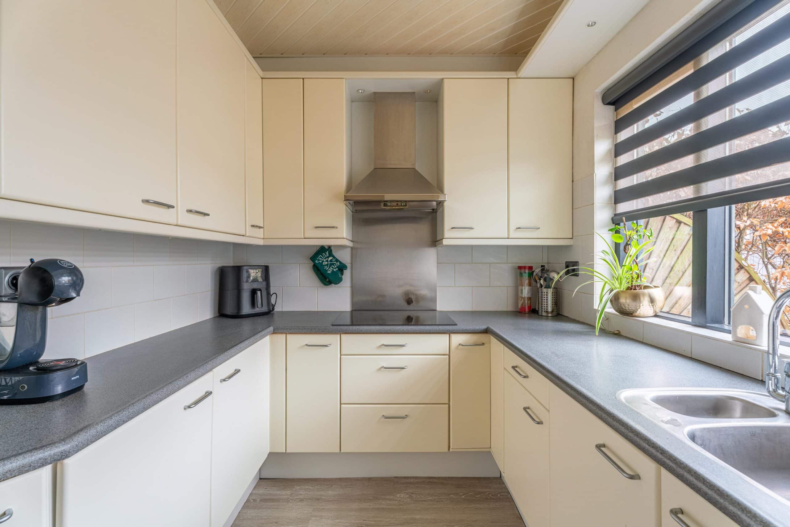 Aan de voorzijde bevindt zich de ruime en lichte keuken, opgesteld in een praktische opstelling en voorzien van diverse inbouwapparatuur, waaronder een kookplaat, afzuigkap, oven en koelkast. Vanuit de keuken heb je direct toegang tot de inpandige garage, ideaal voor opslag of het stallen van fietsen.