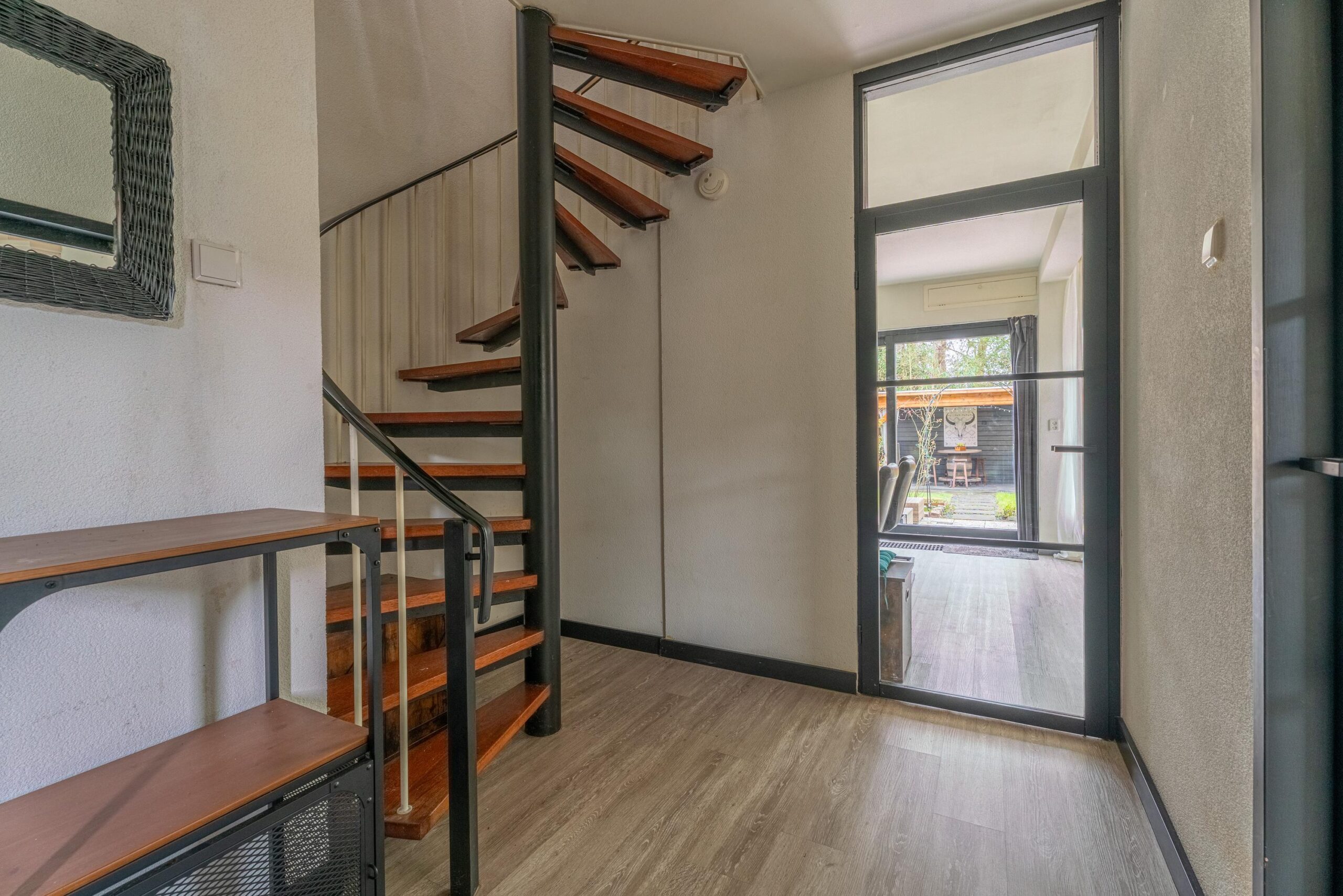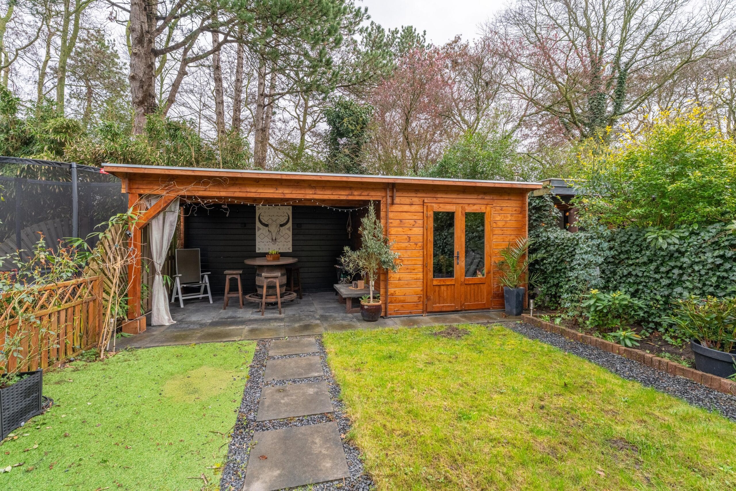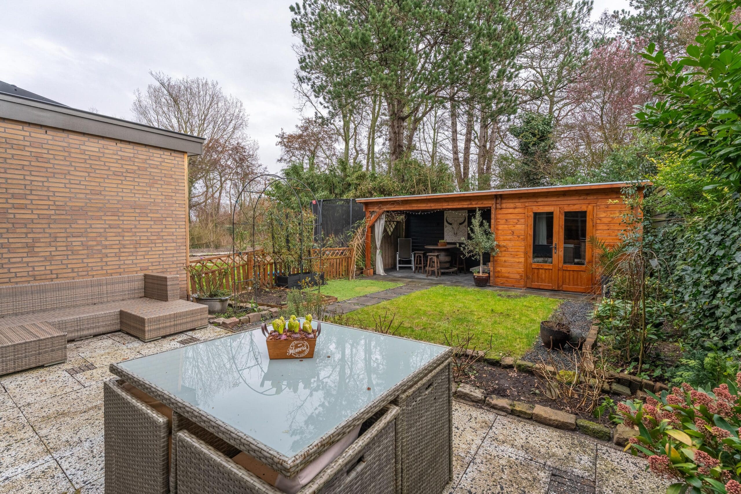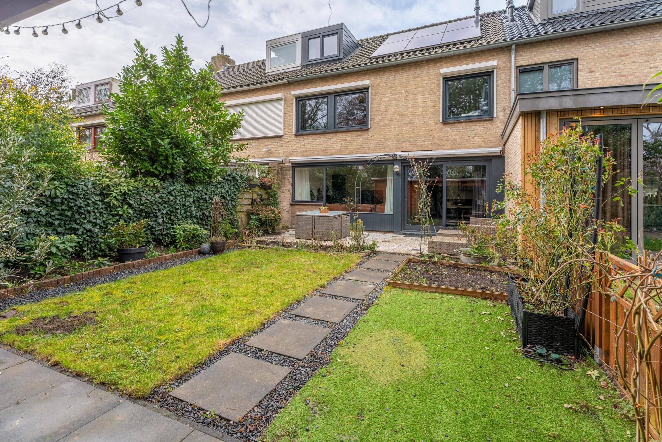 Via de schuifpui bereik je de zonnige achtertuin, gelegen op het zuidoosten. De tuin is verzorgd aangelegd met een combinatie van groen en bestrating en beschikt over een gezellige veranda, ideaal voor lange zomeravonden. Tevens is er een praktische berging aanwezig.