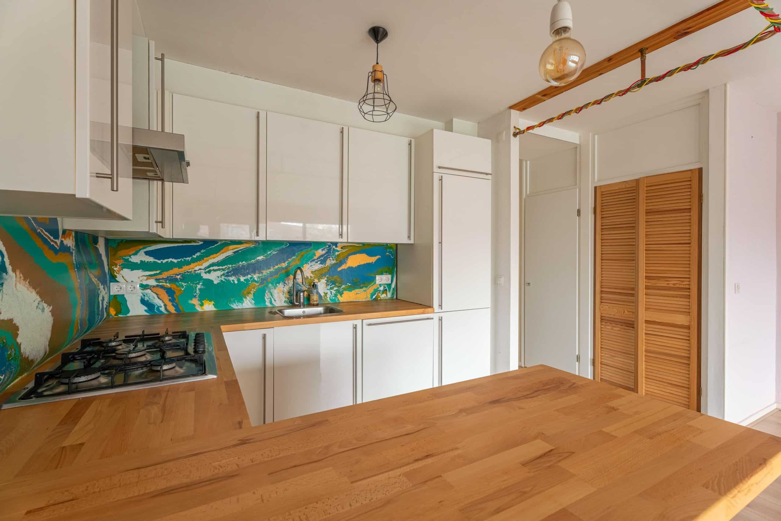 De woonkamer is ruim opgezet en voorzien van een fijne lichtinval, door middel van de grote raampartijen. De open keuken heeft een moderne uitstraling en is uitgerust met diverse inbouwapparatuur, waaronder een gasfornuis, afzuigkap, oven, magnetron, vaatwasser en koel-vriescombinatie.