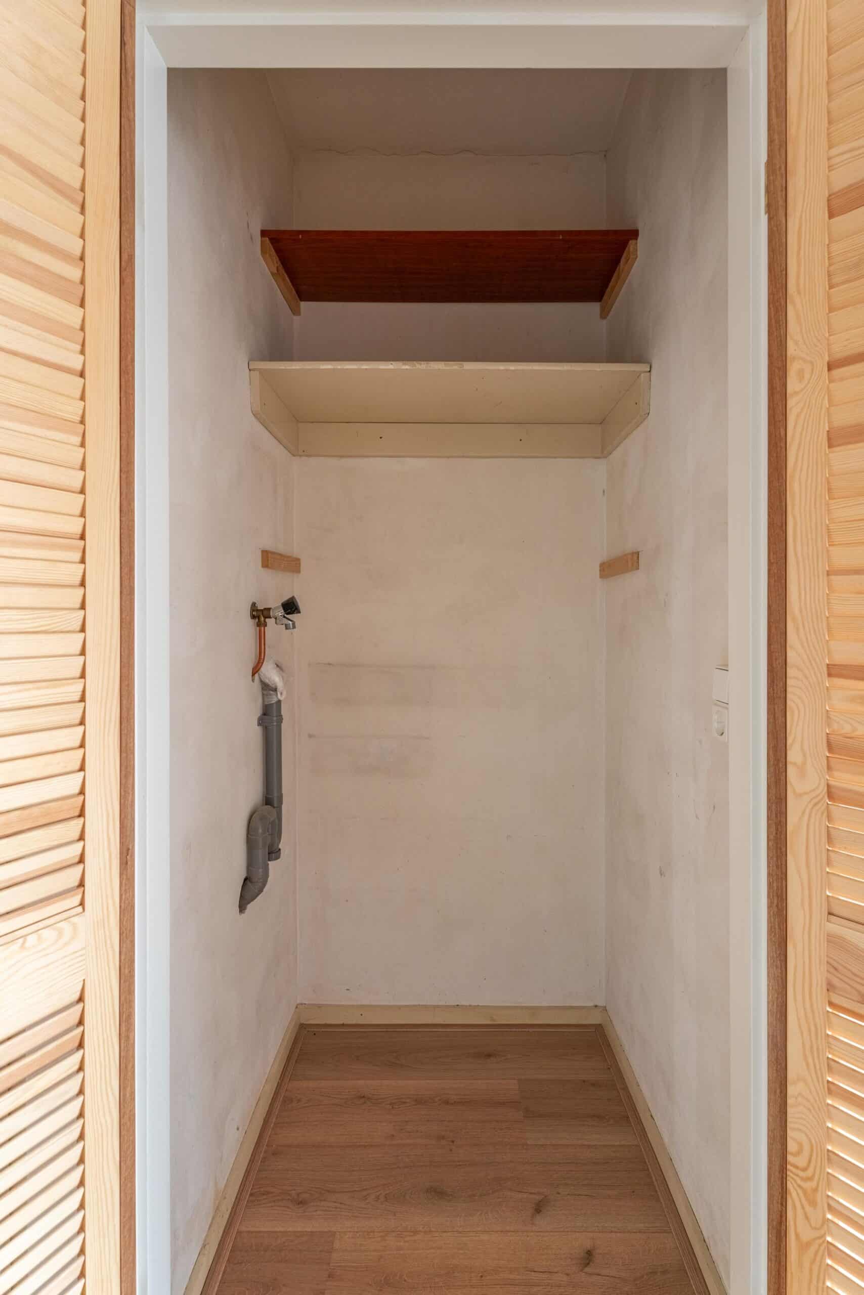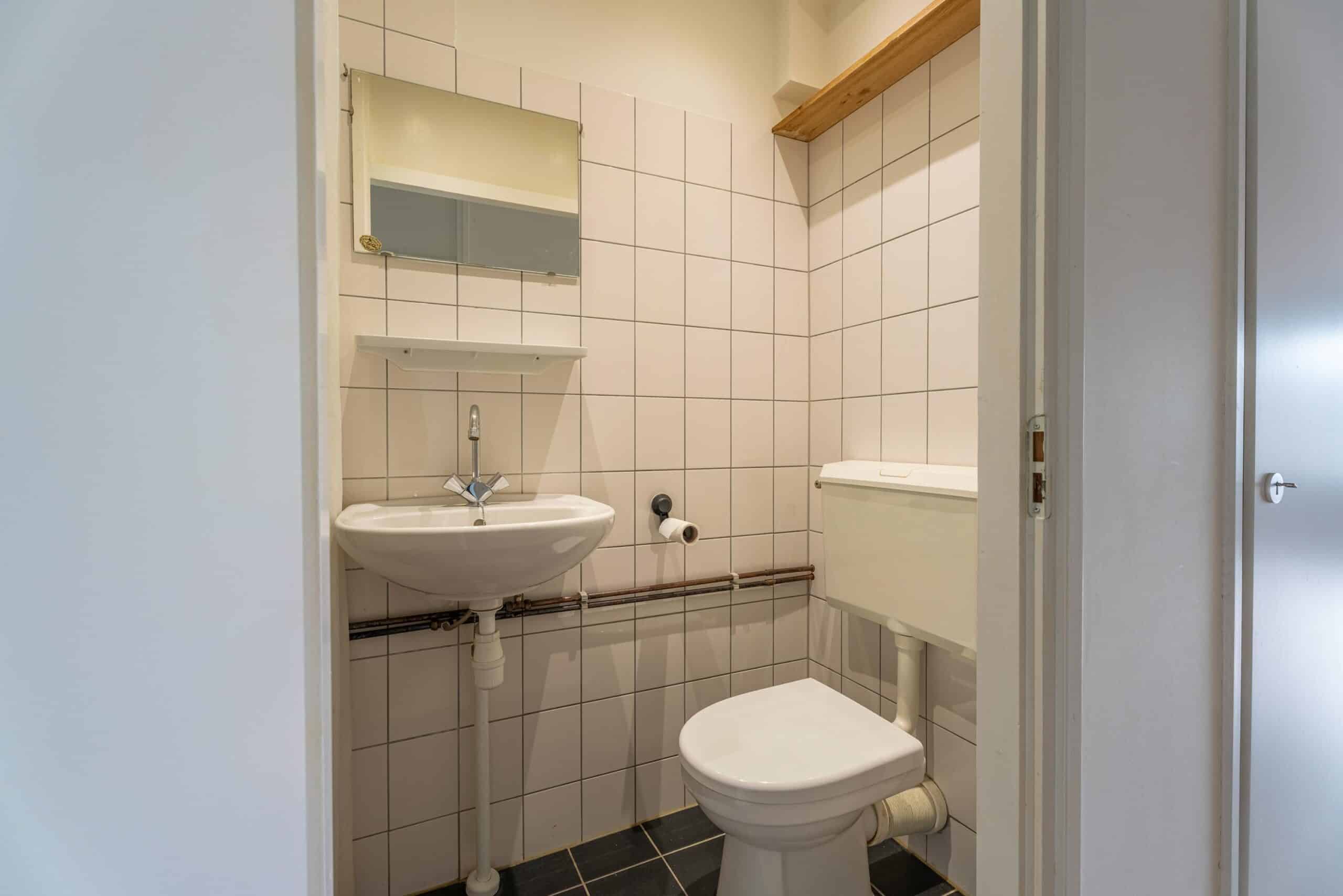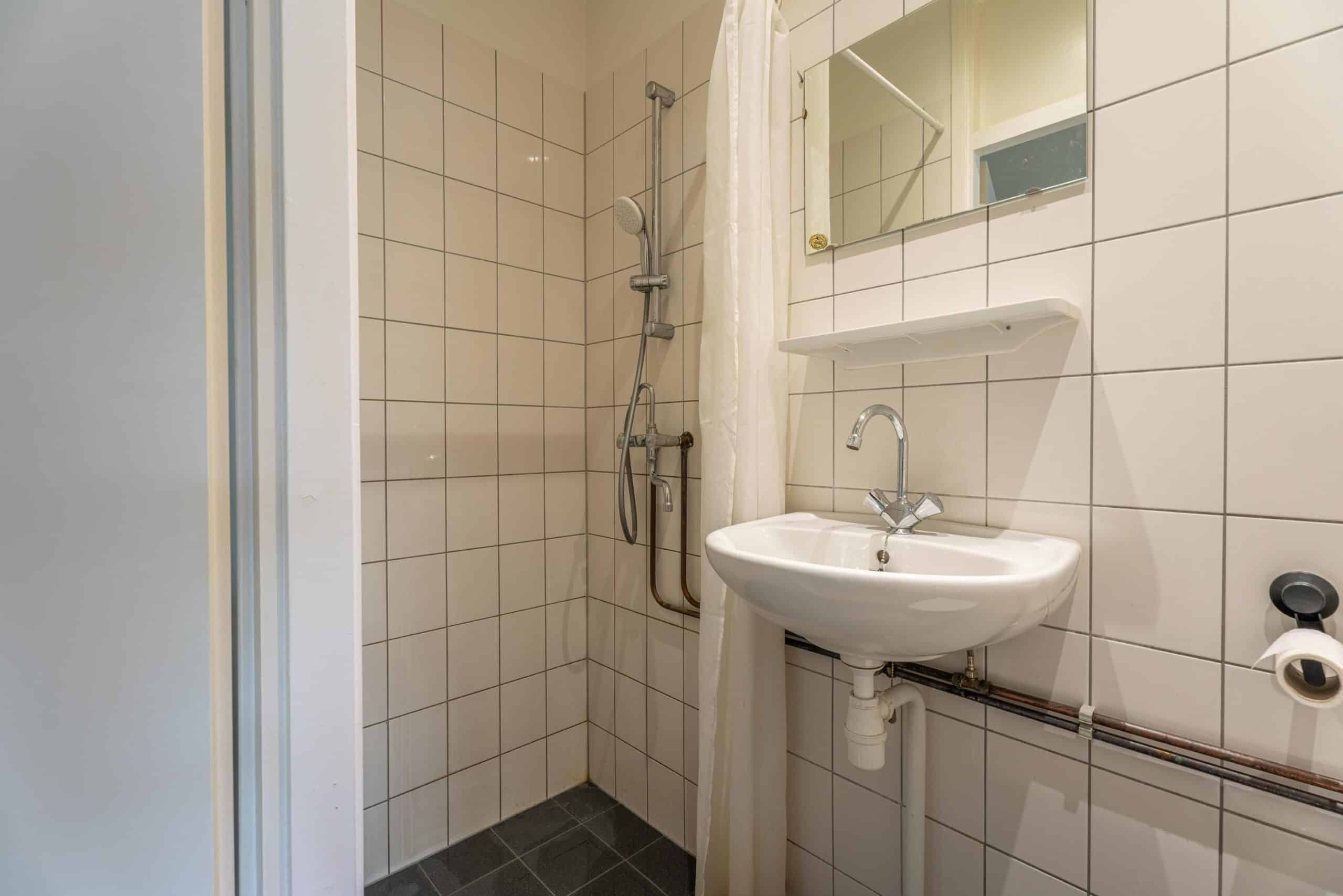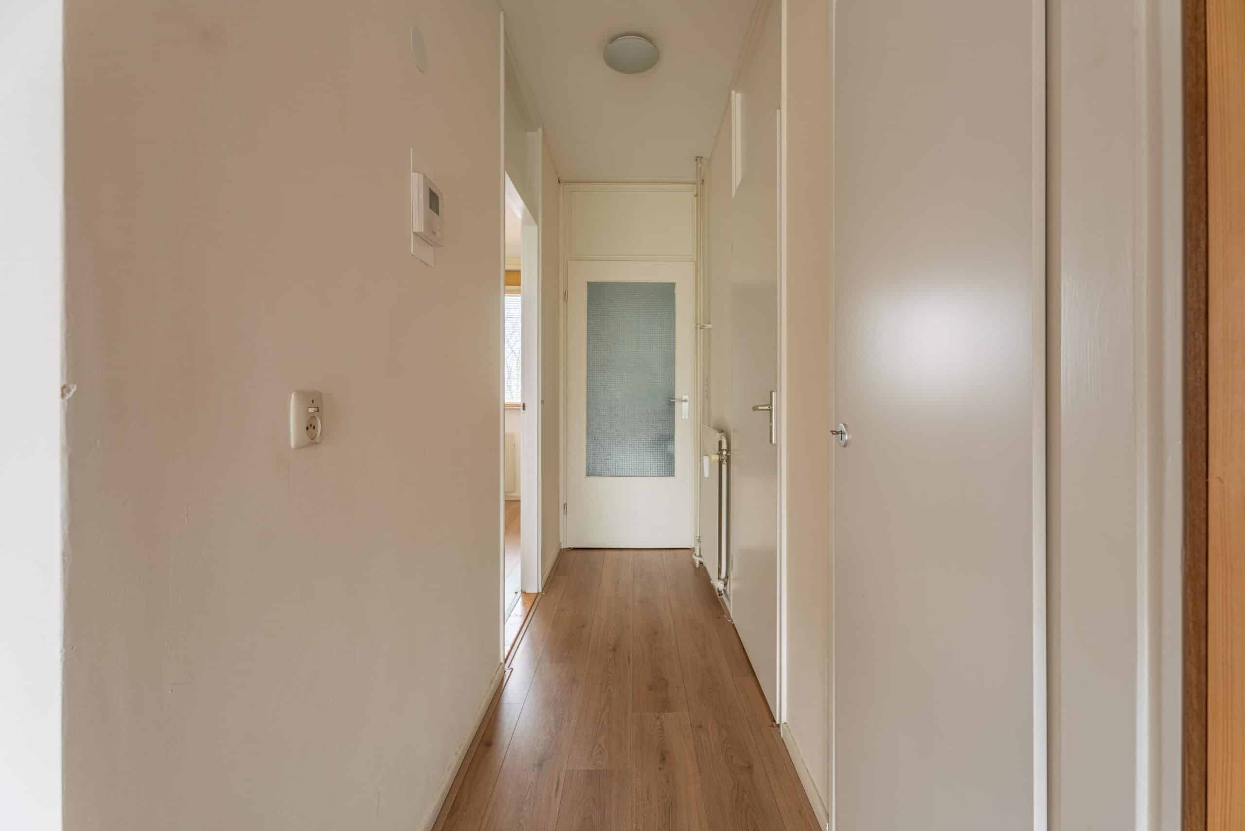 Bij binnenkomst van het appartement bevind je je in de hal die toegang geeft tot alle vertrekken. Direct aan je rechterzijde bevindt zich de eerste slaapkamer van goed formaat. Aan de linkerzijde is de badkamer, voorzien van een douche, wastafel en toilet. Grenzend aan de badkamer bevindt zich een praktische ingebouwde kast die voor extra opbergruimte zorgt.