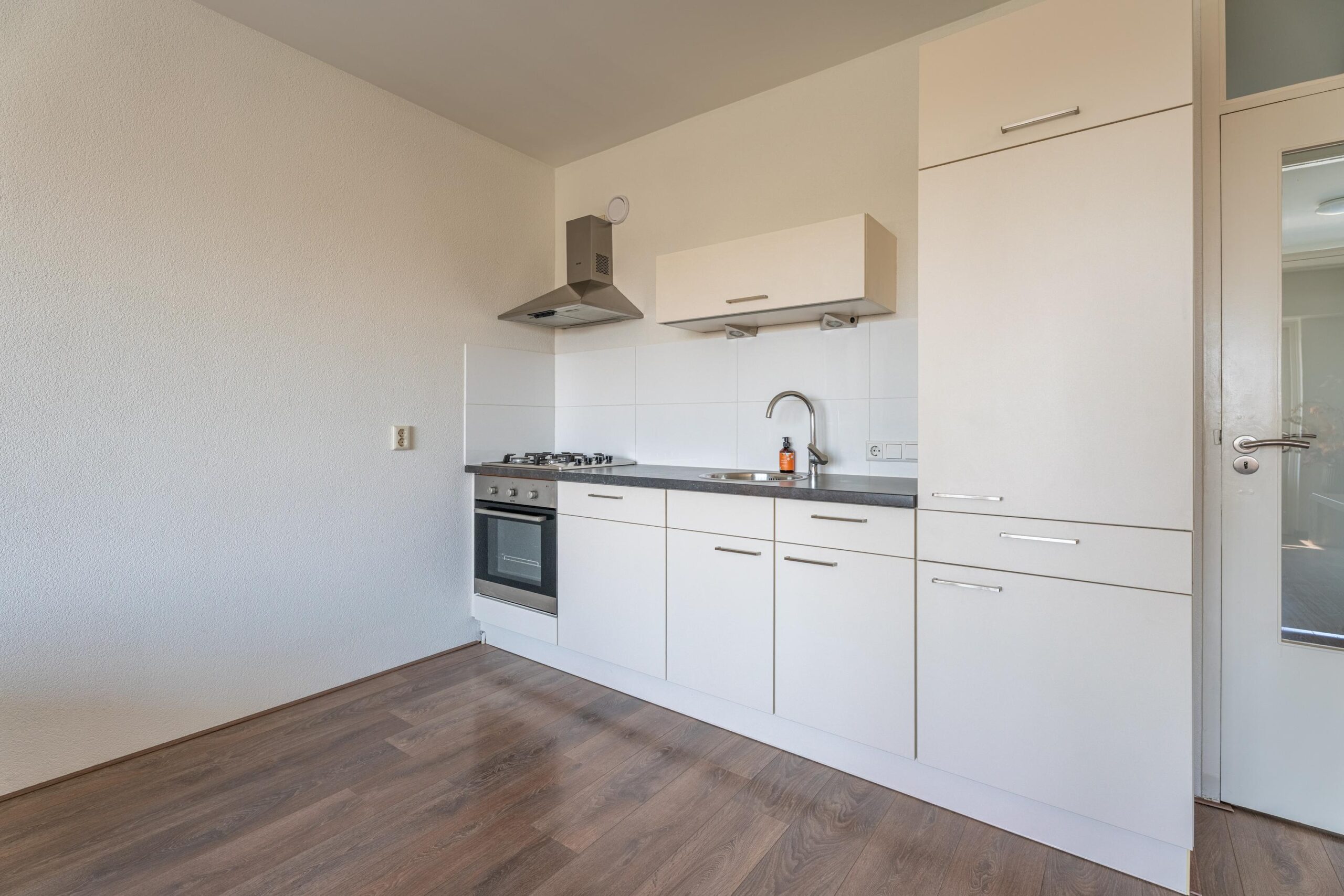 De woonkamer is ruim en licht dankzij de grote raampartijen. Aan de rechterzijde bevindt zich de open keuken, compleet uitgerust met inbouwapparatuur zoals een gasfornuis, afzuigkap, oven, vaatwasser en koel-vriescombinatie.