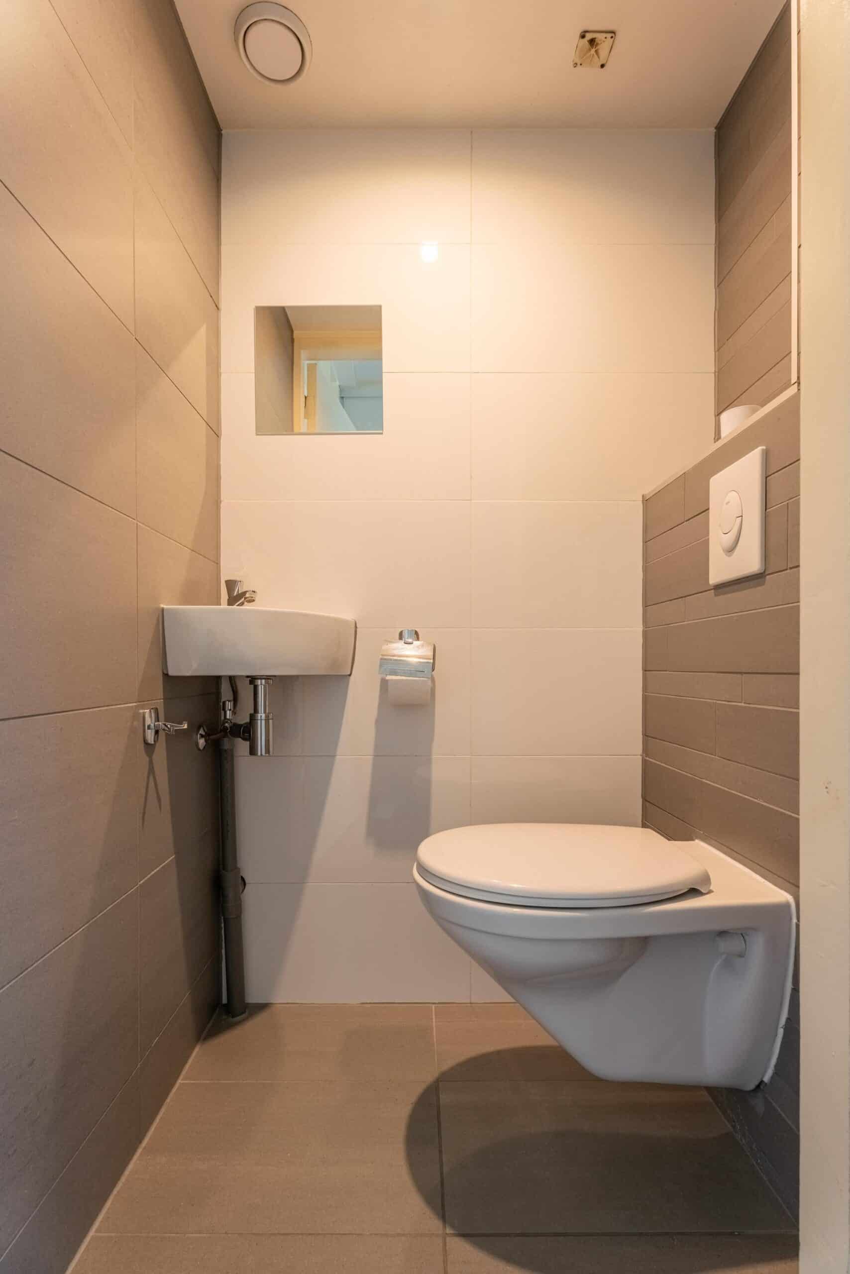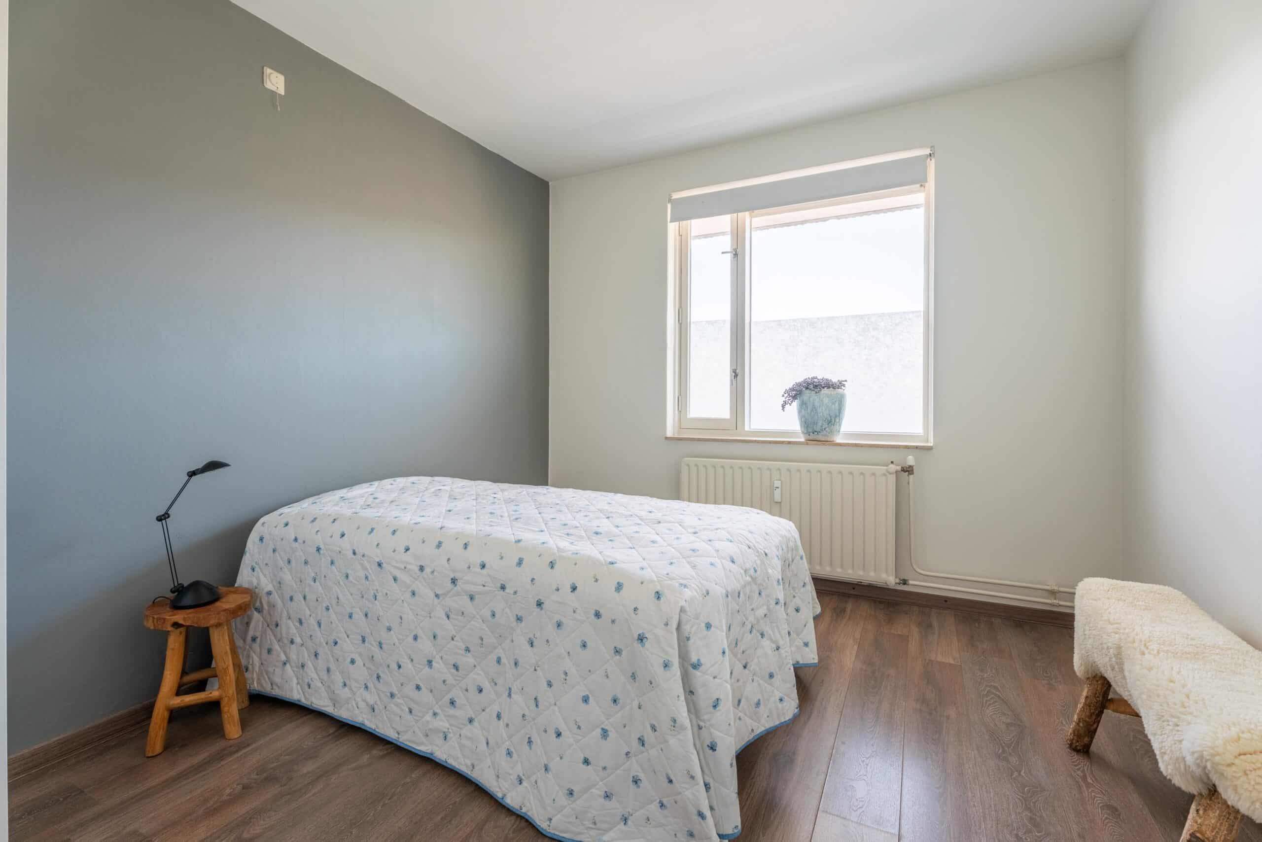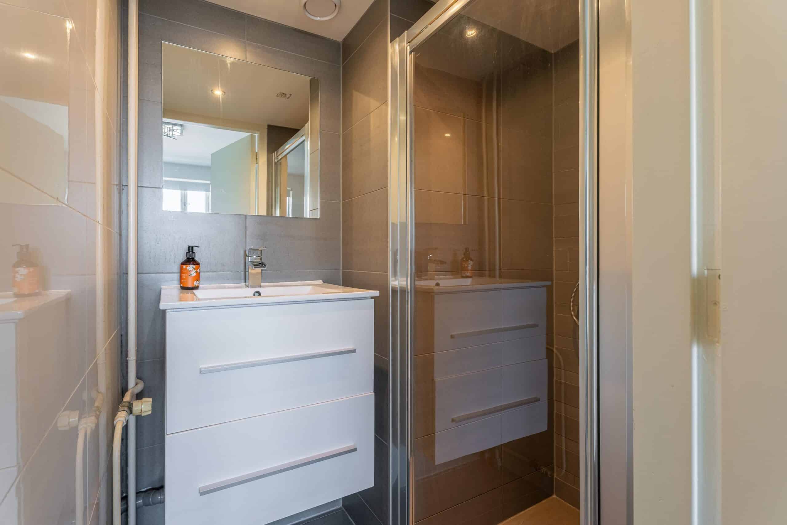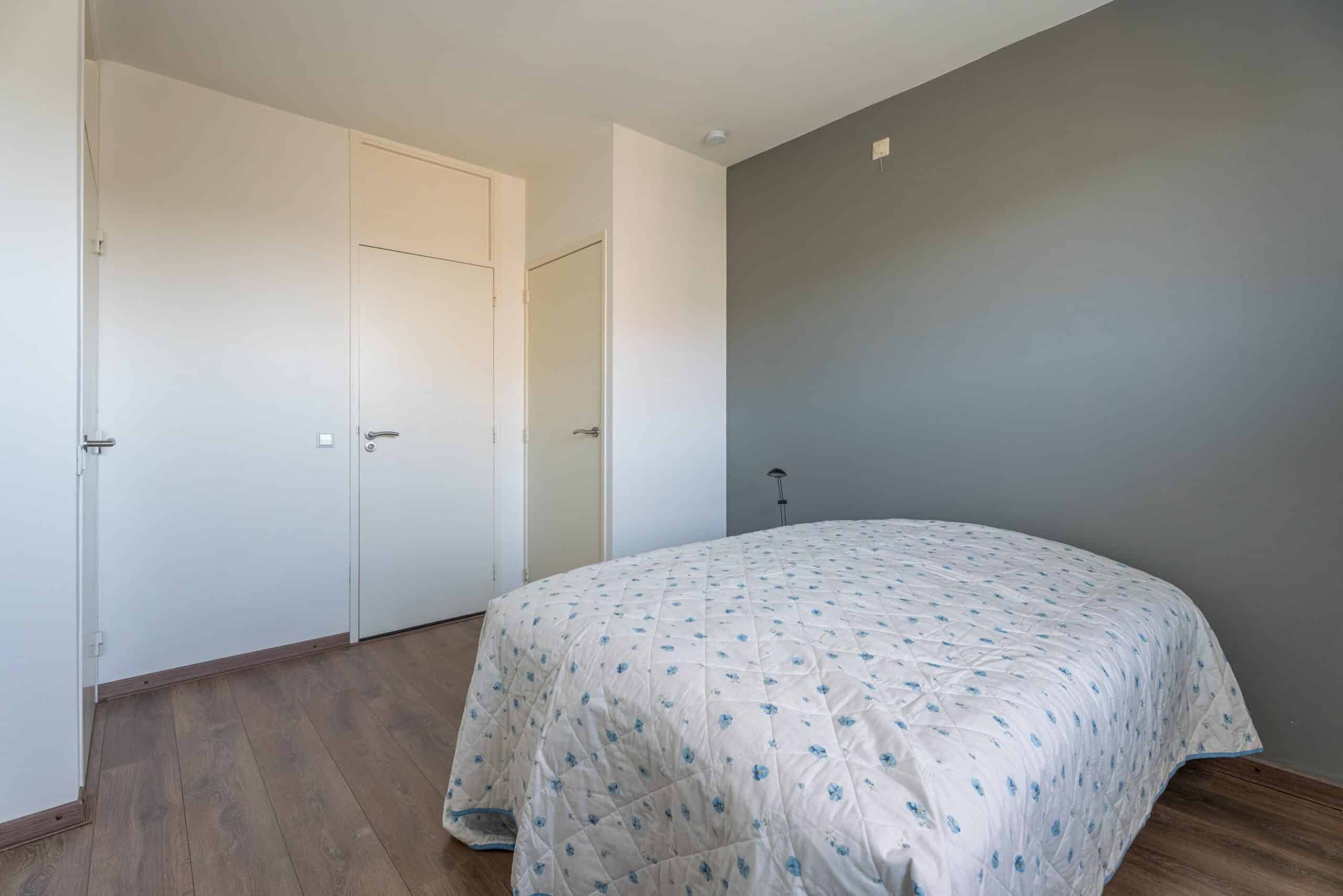 De slaapkamer, gelegen aan de voorzijde, is ruim opgezet en beschikt over een praktische inbouwkast met aansluiting voor de wasmachine. Vanuit de slaapkamer heb je direct toegang tot de badkamer, die is voorzien van een wastafelmeubel en een inloopdouche.