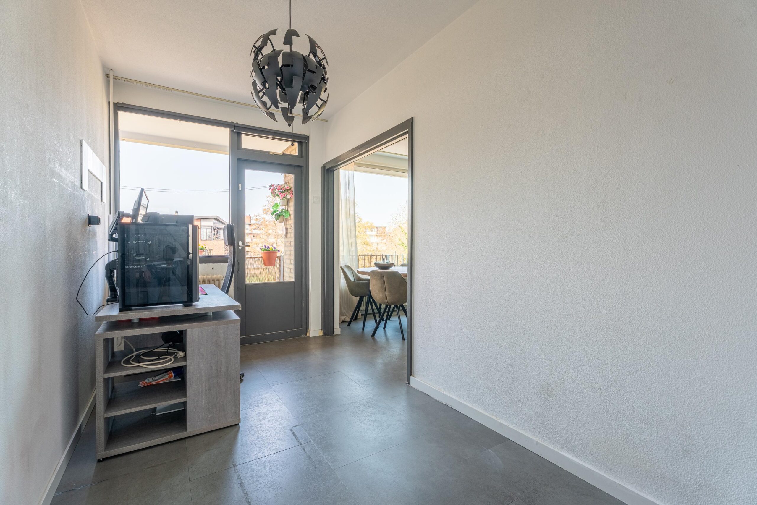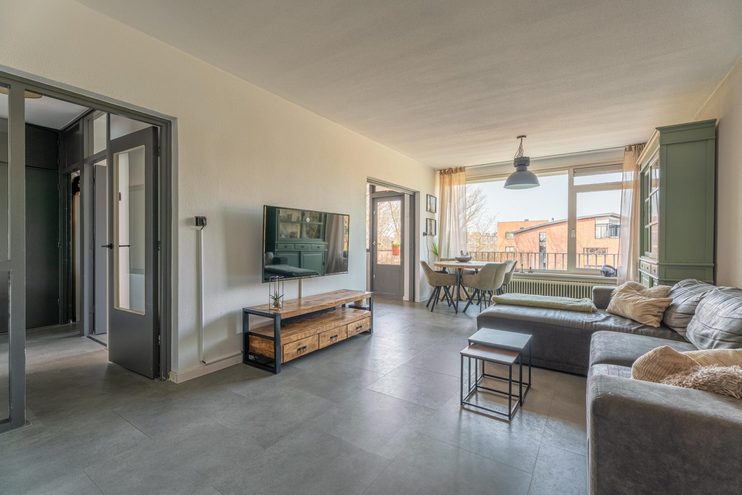 Bij binnenkomst kom je in de entree die toegang biedt tot de ruime en lichte woonkamer. Dankzij de grote raampartijen geniet de woonkamer van een prettige lichtinval en een open sfeer.