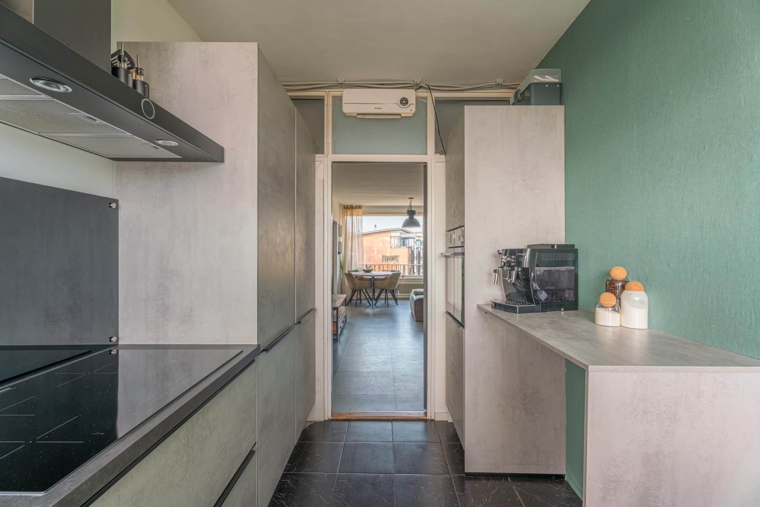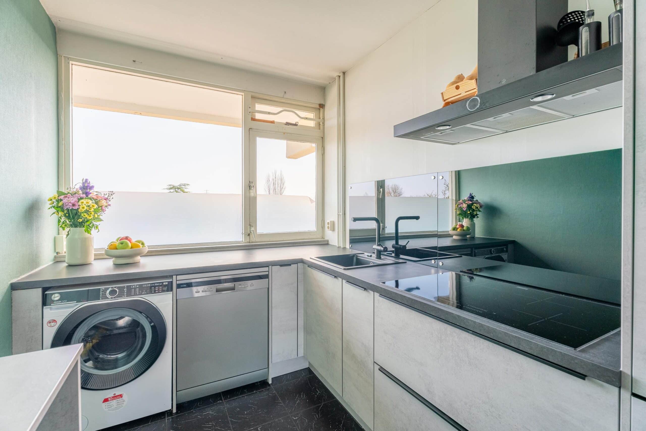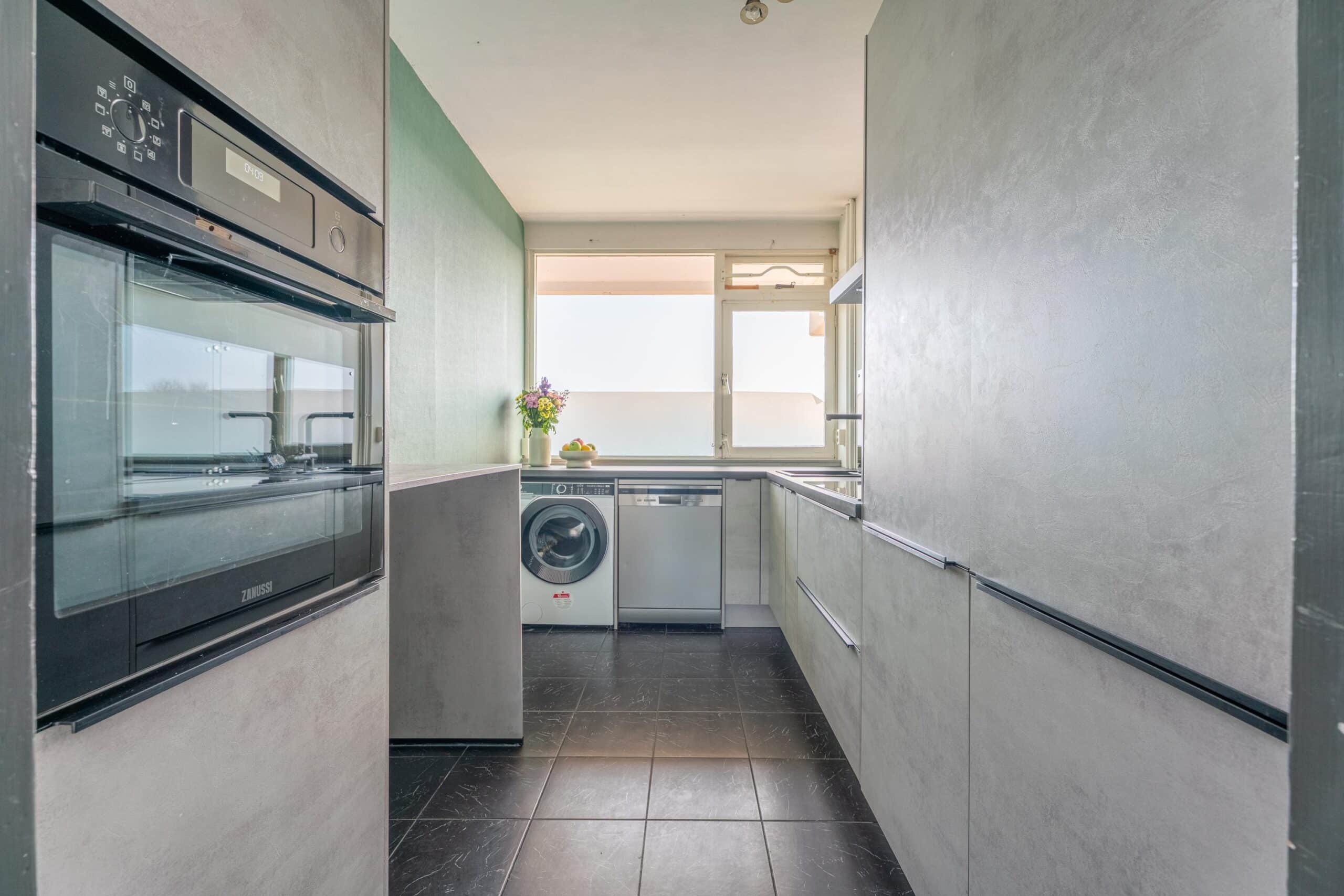 Grenzend aan de woonkamer bevindt zich de gesloten keuken. Deze is uitgerust met diverse inbouwapparatuur, waaronder een vaatwasser, oven, kookplaat, afzuigkap en een koel-vriescombinatie. Tevens bevindt zich hier de aansluiting voor de wasmachine.