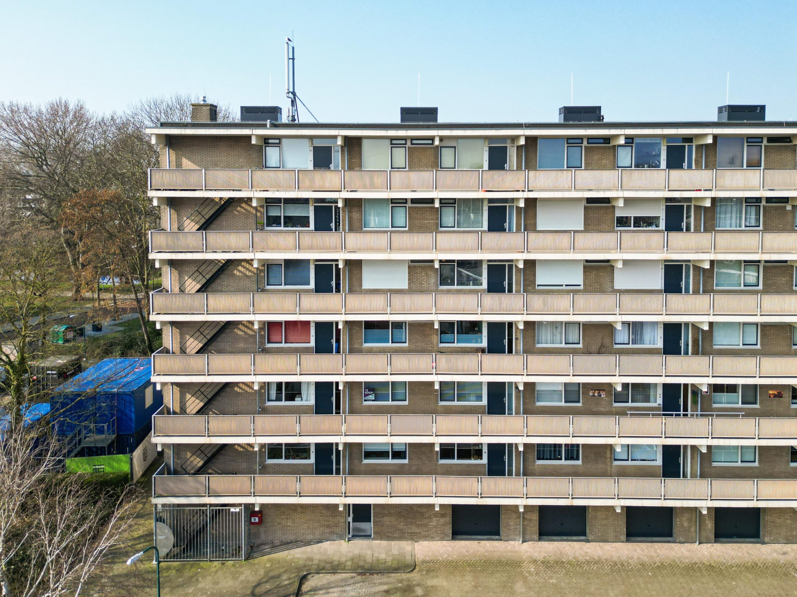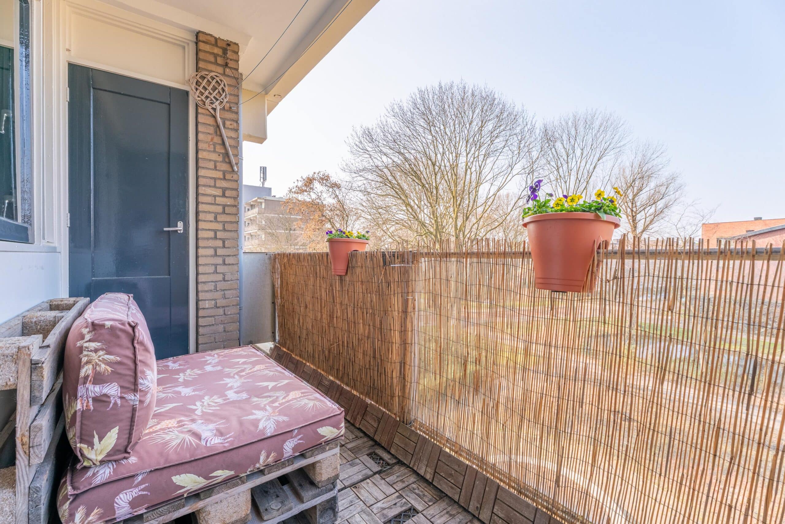 Het balkon, gelegen op het westen, biedt een prettig uitzicht over de groene omgeving. Het balkon is bereikbaar vanuit de slaapkamer die grenst aan de woonkamer en beschikt over een eigen berging.