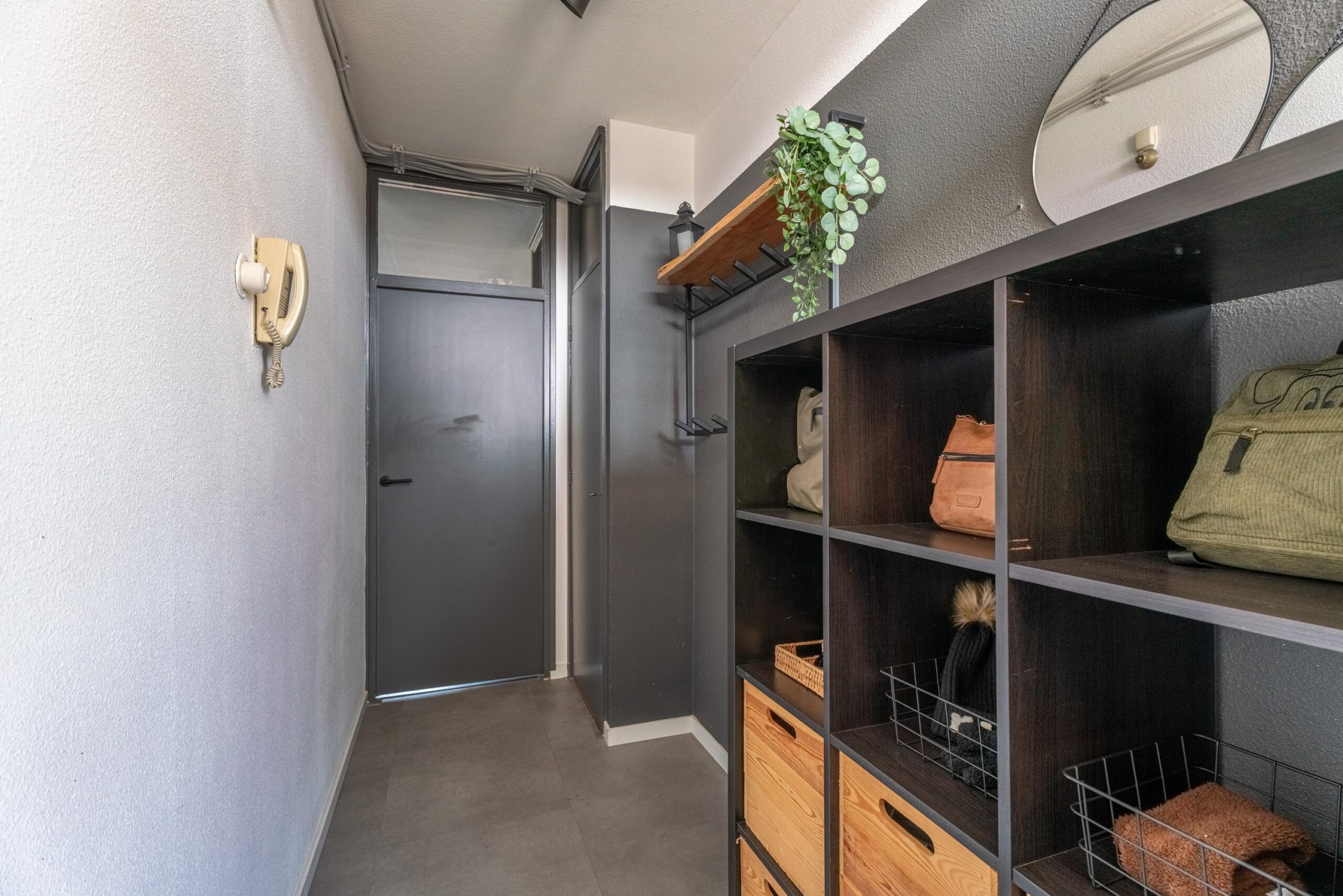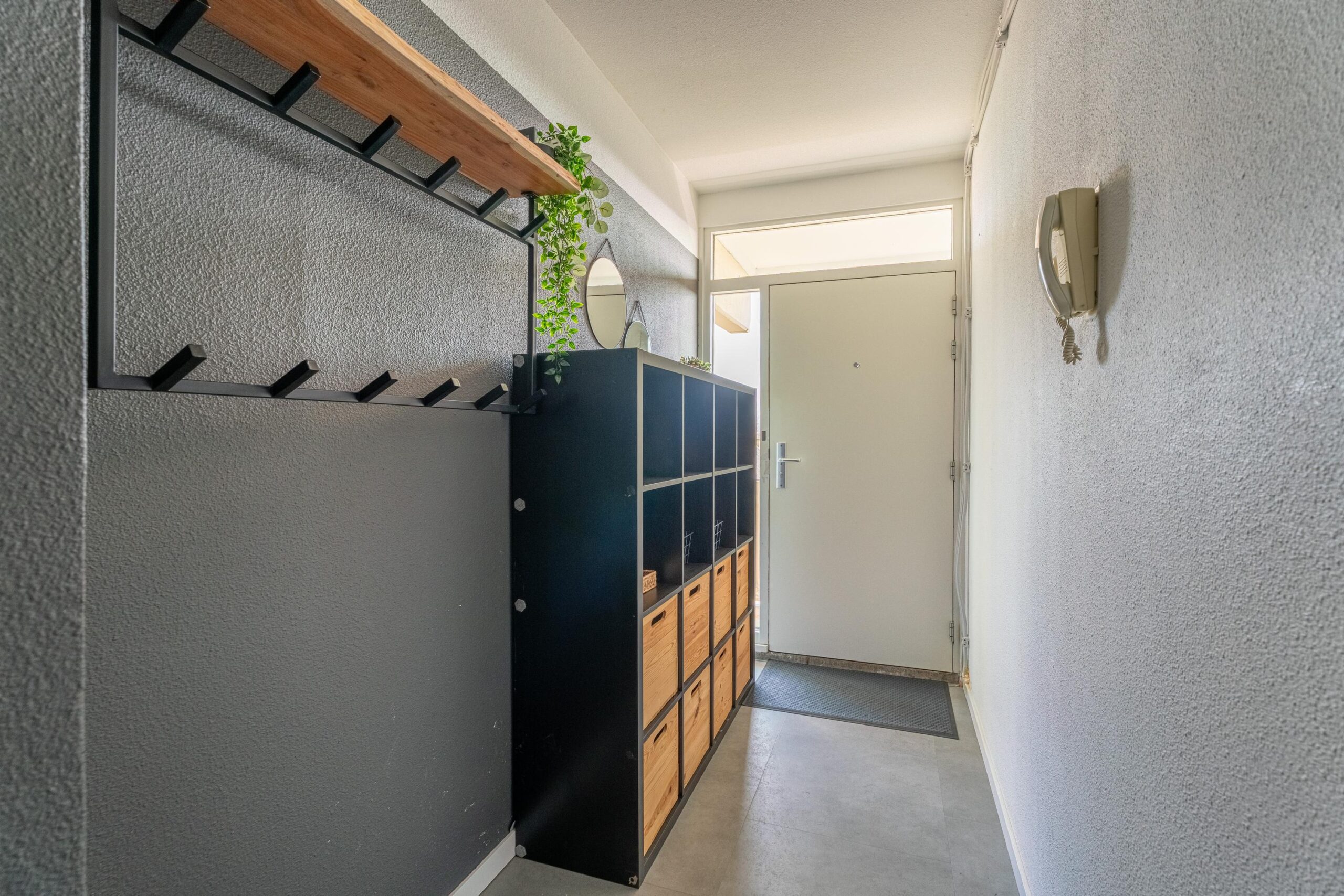 Gemeenschappelijke entree met bellentableau, trappenhuis en lift.