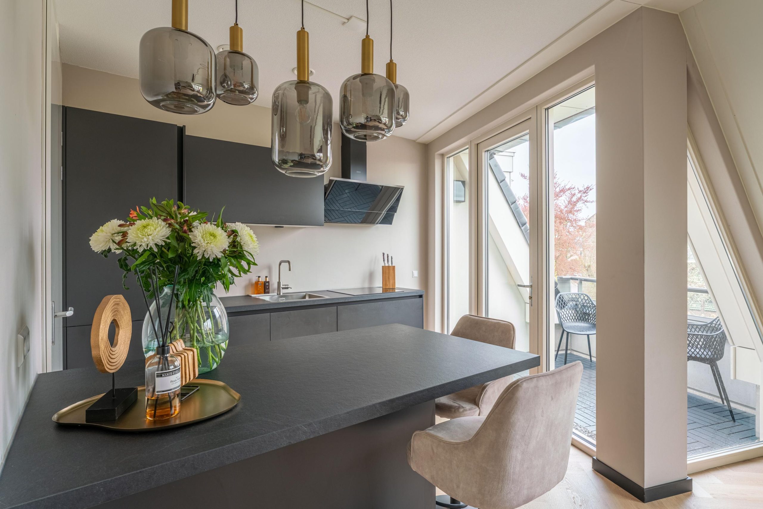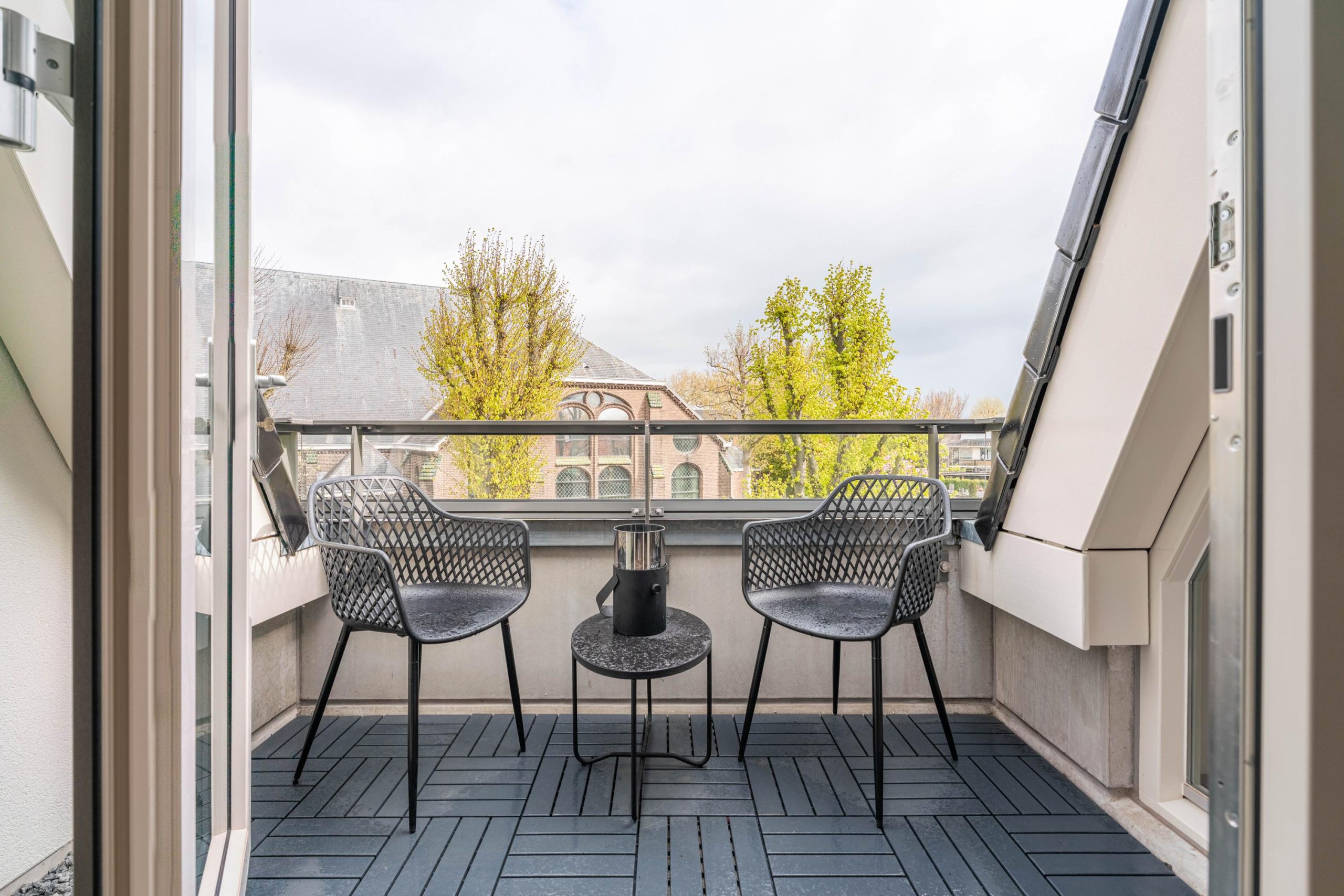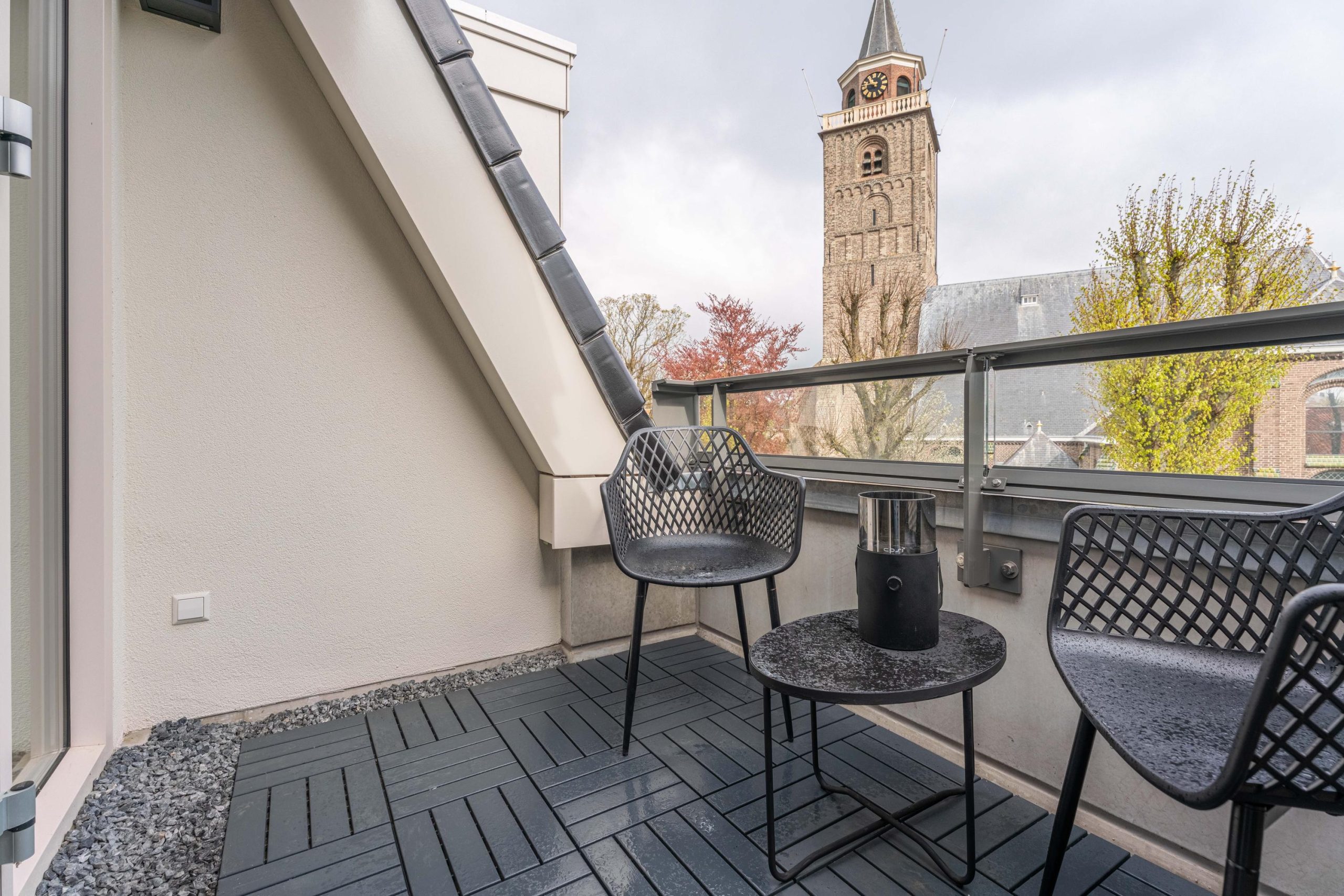 Vanuit de woonkamer heb je toegang tot het balkon, gelegen op het noorden, met uitzicht op de kerk.