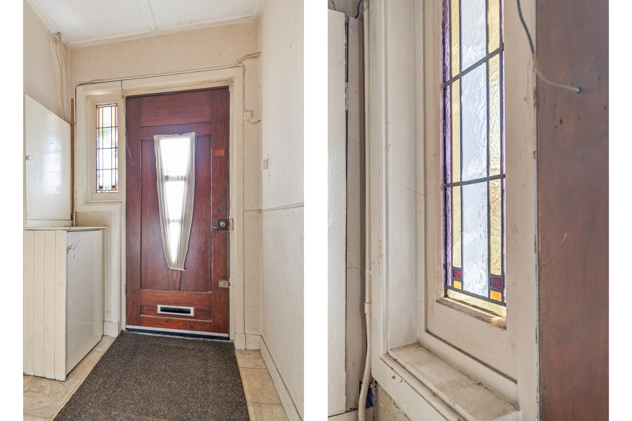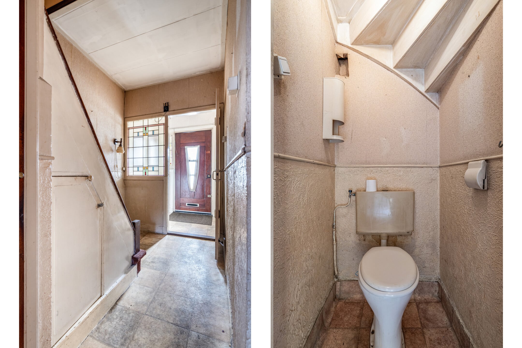 Via de voortuin bereik je de entree van de woning. Hal met meterkast, trapopgang en separaat toilet.