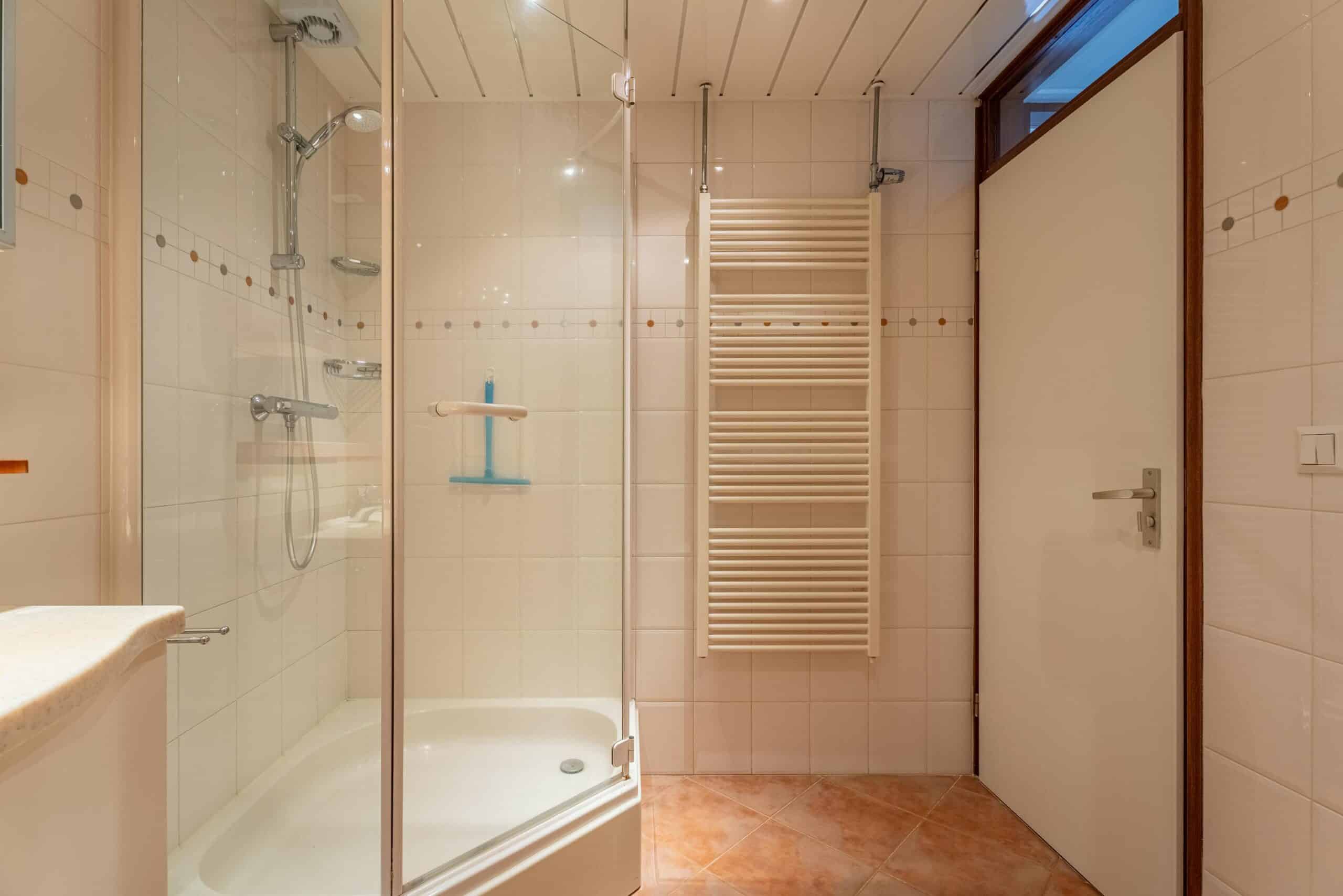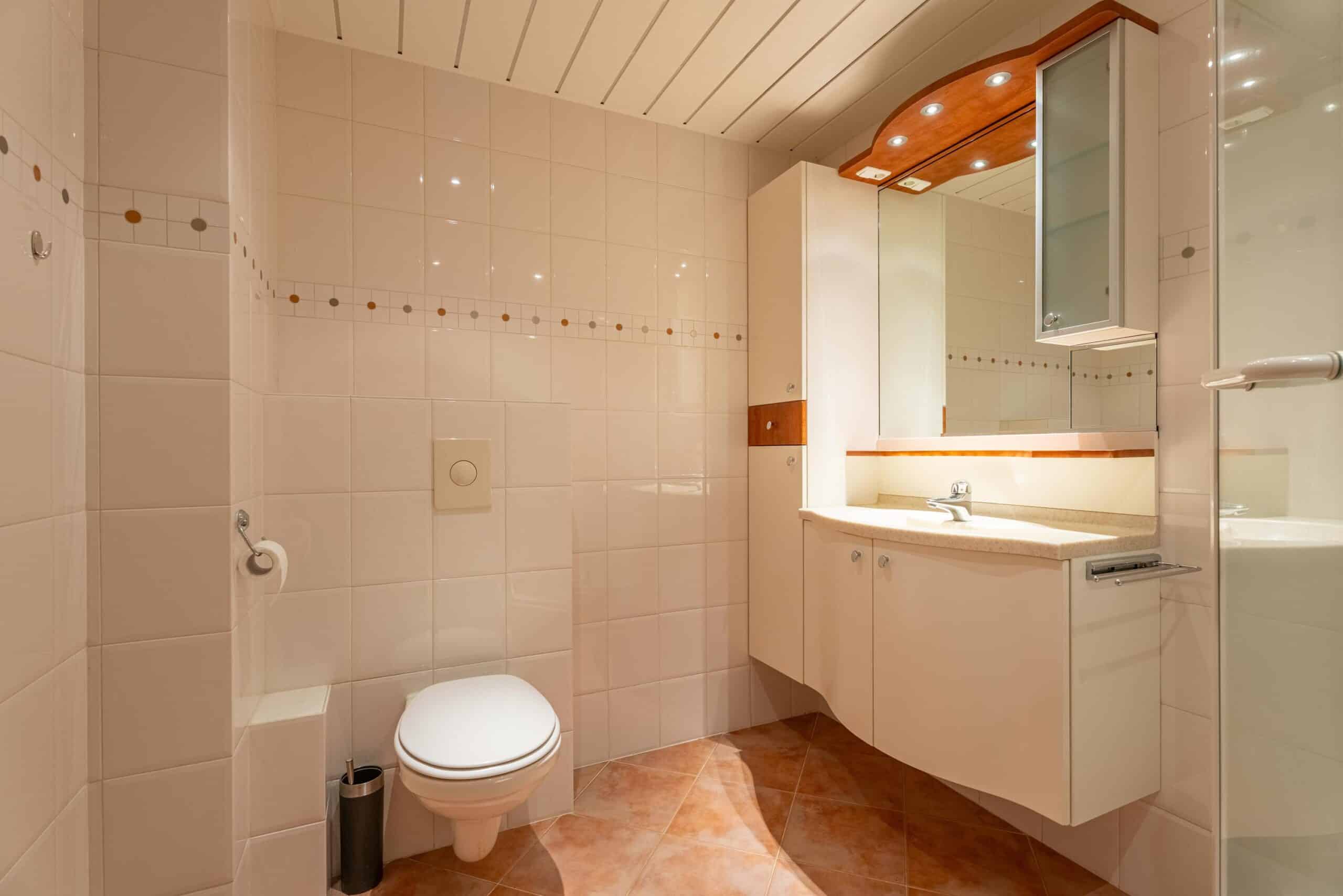 De badkamer is voorzien van een douche, toilet en een wastafelmeubel.