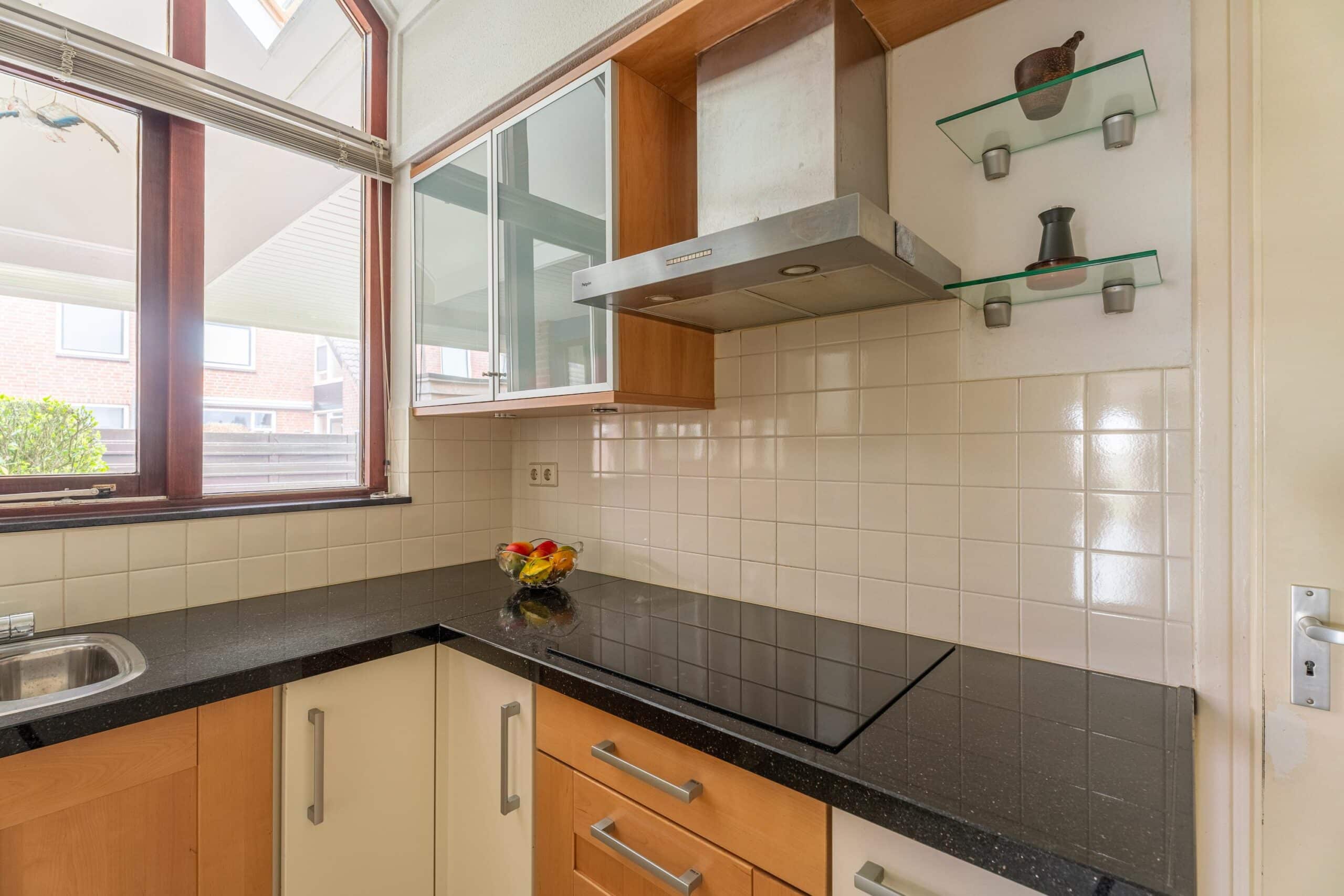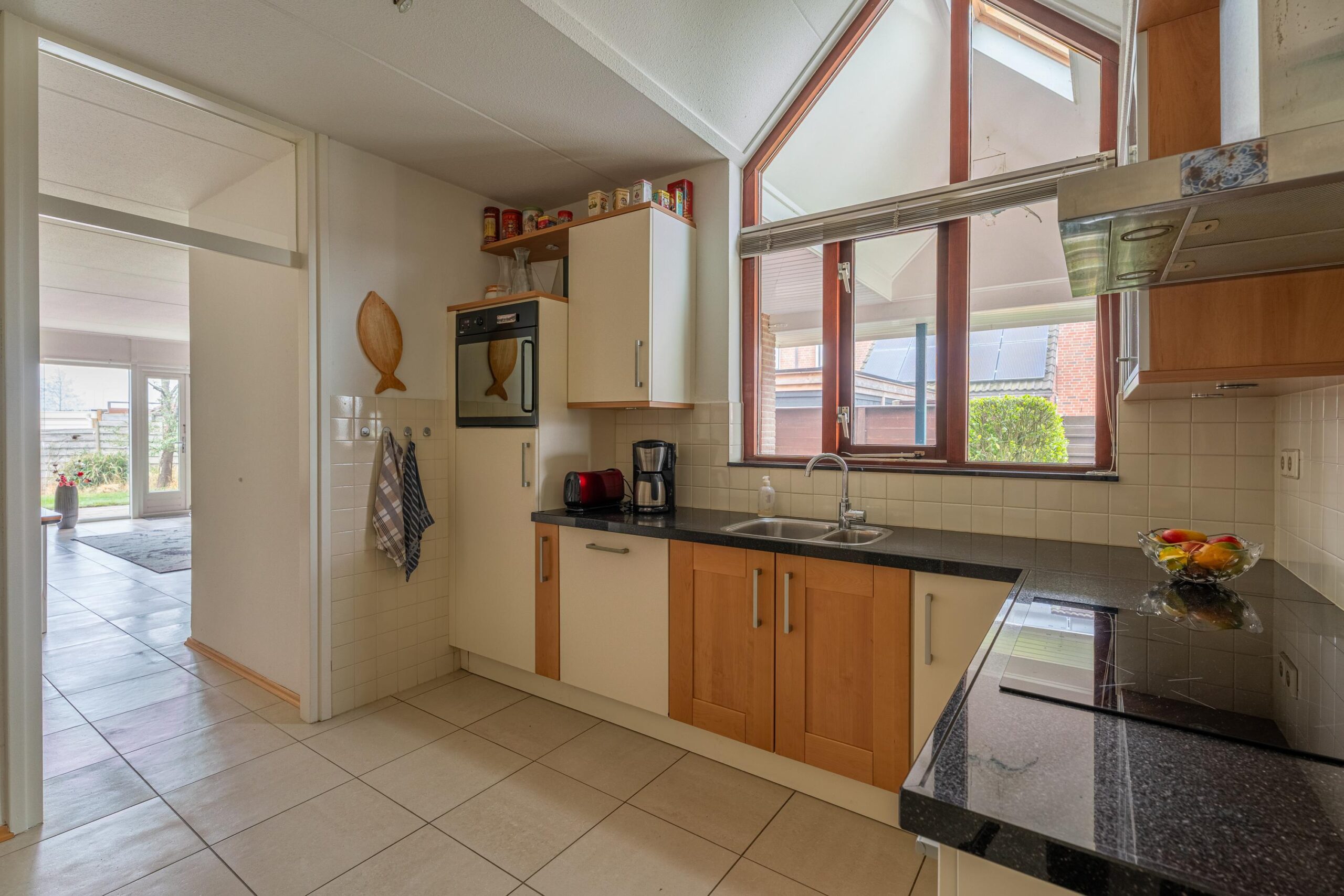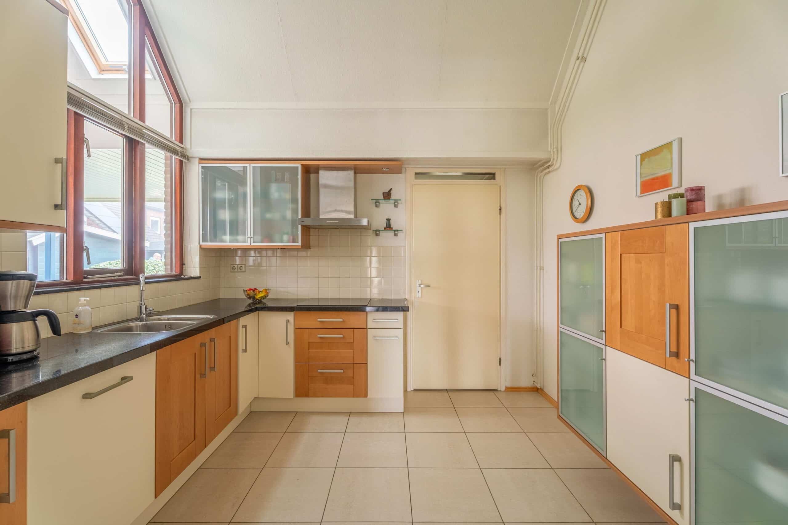 De keuken bevindt zich aan de voorzijde van de woning en is voorzien van diverse inbouwapparatuur, waaronder een kookplaat, afzuigkap, vaatwasser, oven en koelkast. Vanuit de keuken heb je toegang tot de praktische bijkeuken, die tevens bereikbaar is via de oprit.