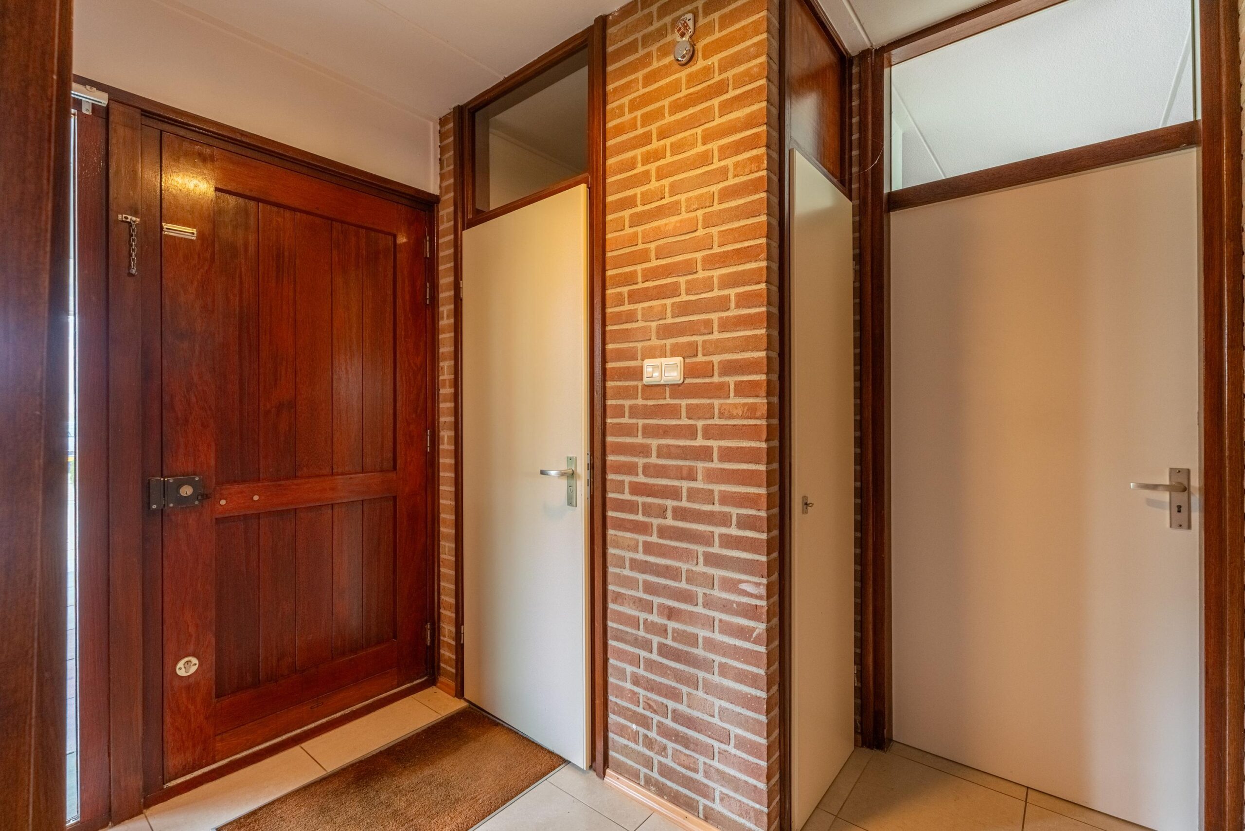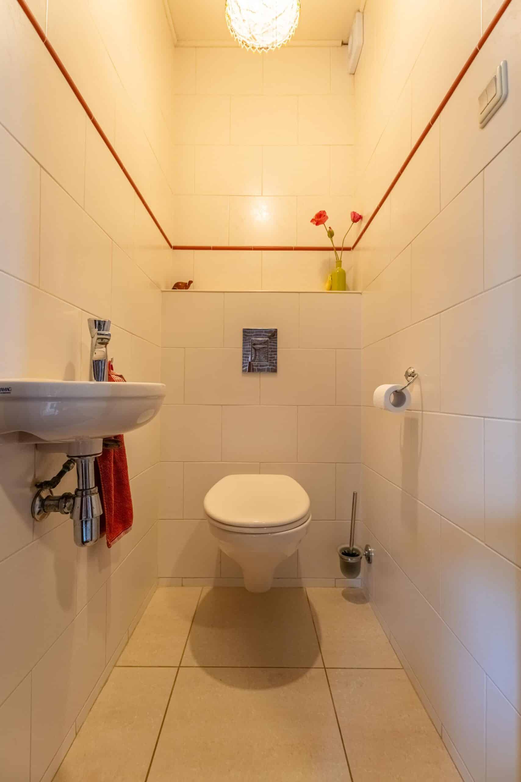 Via de ruime oprit met plaats voor twee auto’s bereik je de entree van de woning. In de hal bevinden zich de meterkast, het toilet met fonteintje en de trapopgang naar de eerste verdieping.