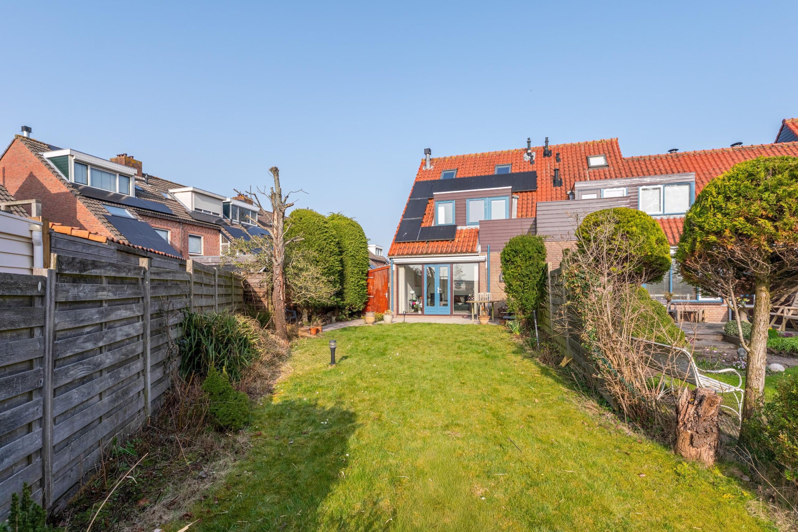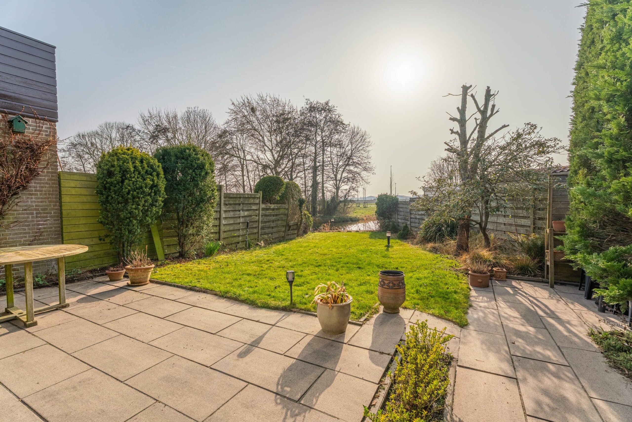 Via de woonkamer bereik je de achtertuin. De tuin is ruim, groen aangelegd en gelegen op het zuidwesten, waardoor je hier heerlijk van de zon kunt genieten. Aan de achterzijde grenst de tuin direct aan het vaarwater.