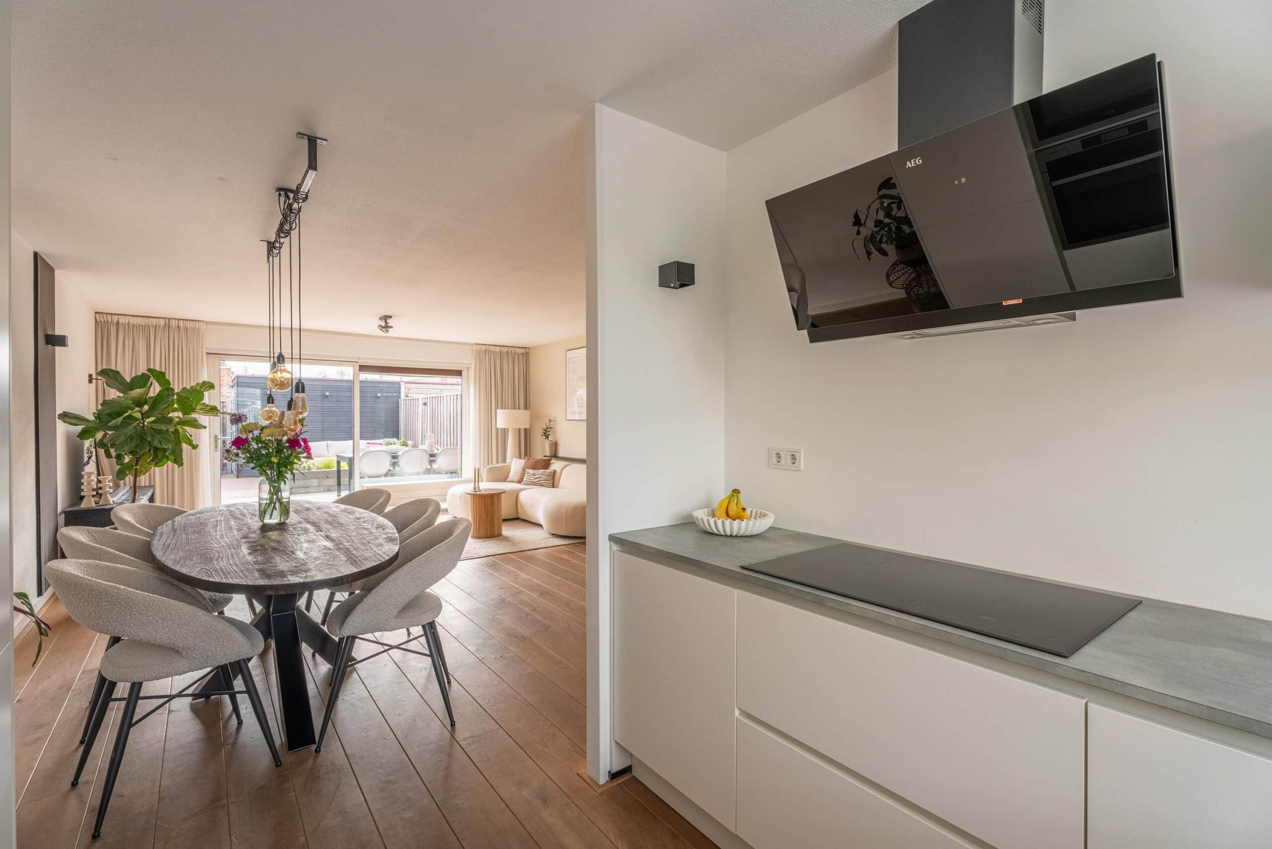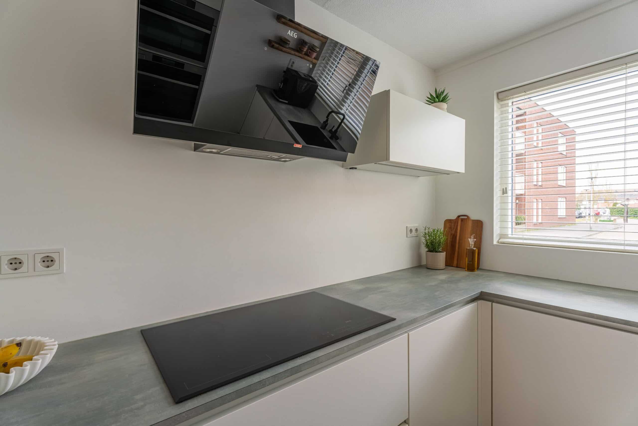 De open keuken (2021) aan de voorzijde van de woning is uitgerust met diverse inbouwapparatuur, waaronder een inductiekookplaat, afzuigkap, vaatwasser, combi-oven en stoomoven.