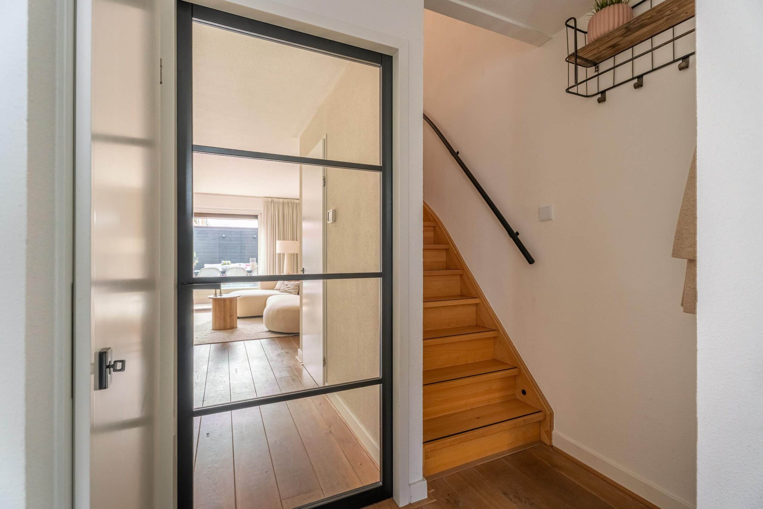 Middels de voortuin bereik je de entree met aan je rechterzijde het moderne toilet met fonteintje en de trapopgang en aan de linkerzijde de meterkast. Bij betreding van de woonkamer vind je aan de rechterzijde een praktisch ingebouwde kast die extra opbergruimte biedt. De royale woonkamer is voorzien van een prettig lichtinval dankzijde de grote raampartijen.